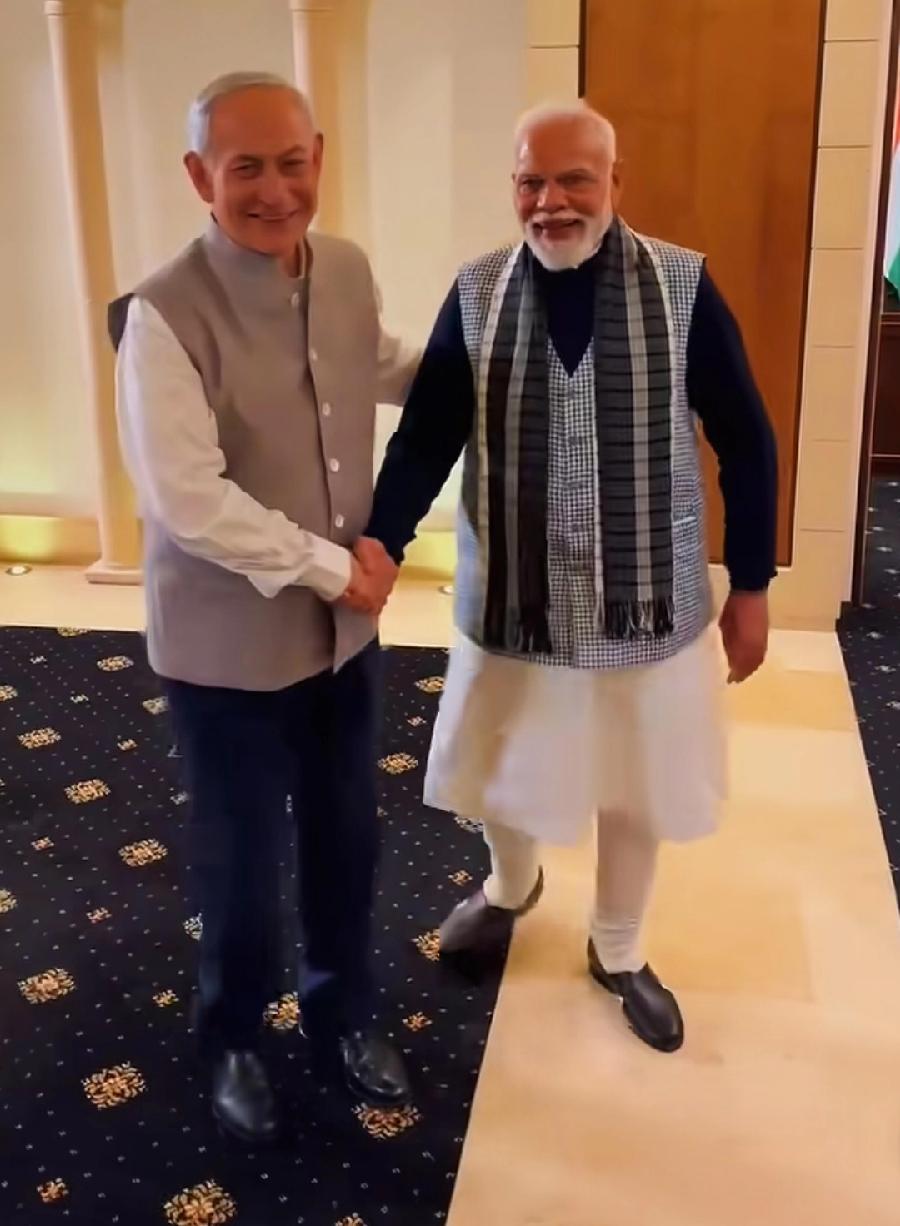 内塔尼亚胡穿着印度传统服装,与莫迪共进晚餐,很有诚意,可还是下手不够狠,只穿了上衣马褂,学莫迪学一半,直筒裙、裹布直筒裤没穿,穿得不伦不类,不像印度服装,倒是有点像,我们民国时代酒保店小二!莫迪这次访问,以色列、内塔尼亚胡,给予了空前绝后的规格礼遇,小细节拉满!