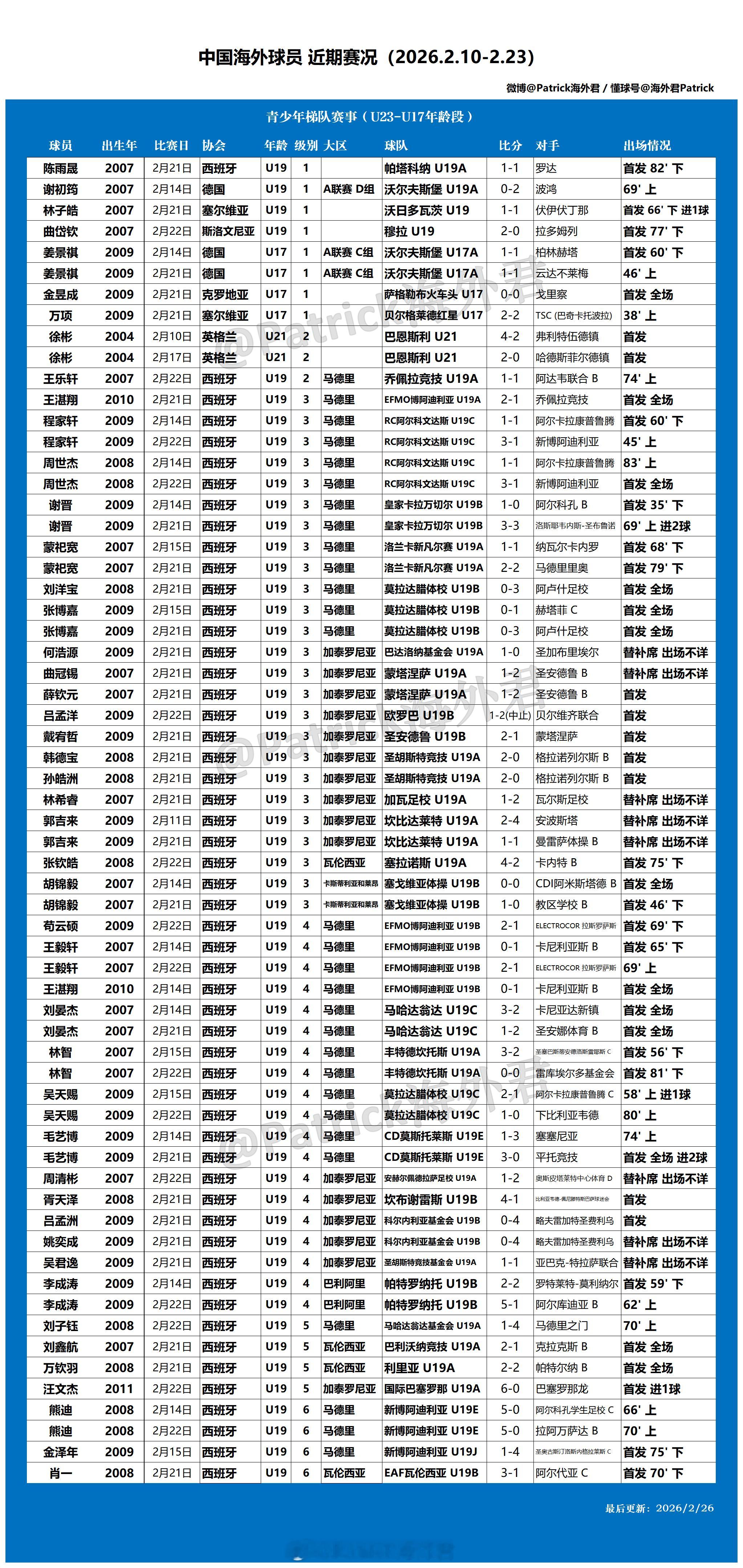 留洋周报 海外球员比赛一览 (2026年2月10日-2月23日)