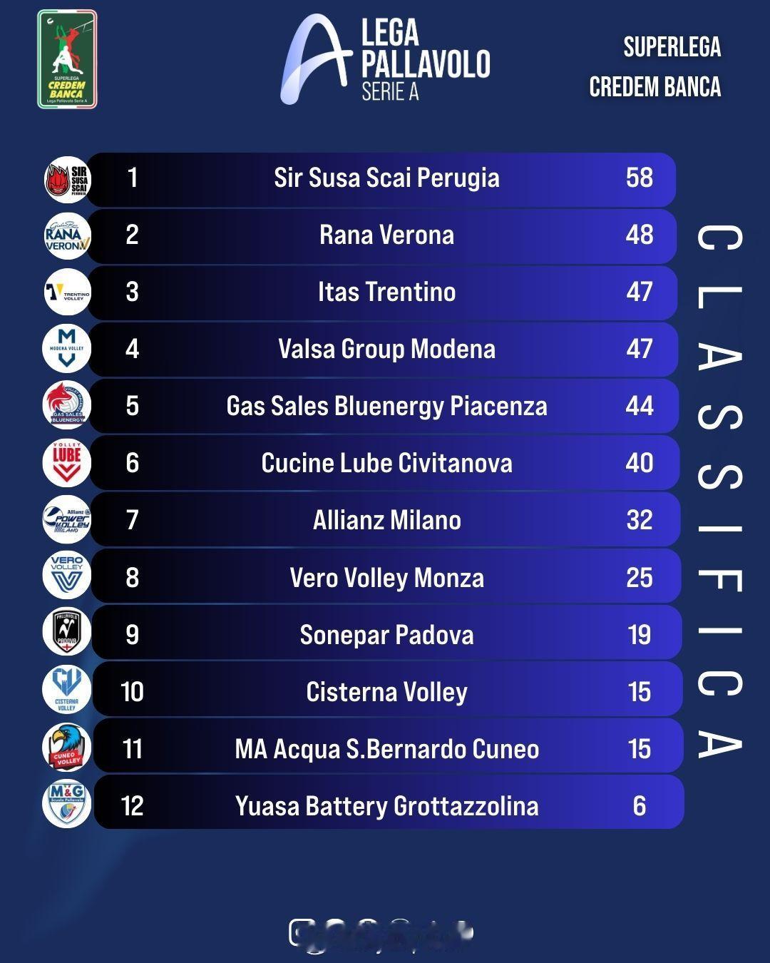 【意超男排八强对阵形势】国际排坛动态 2月25日,意超男排常规赛结束,季后赛八强水落石出,格罗塔佐利纳不幸降级。八强对阵如下(括号内常规赛排名):上半区:佩鲁贾(1)vs蒙扎(8)摩德纳(4)vs皮亚琴察(5)下半区:维罗纳(2)vs米兰(7)特伦蒂诺(3)vs奇维塔诺瓦(6)