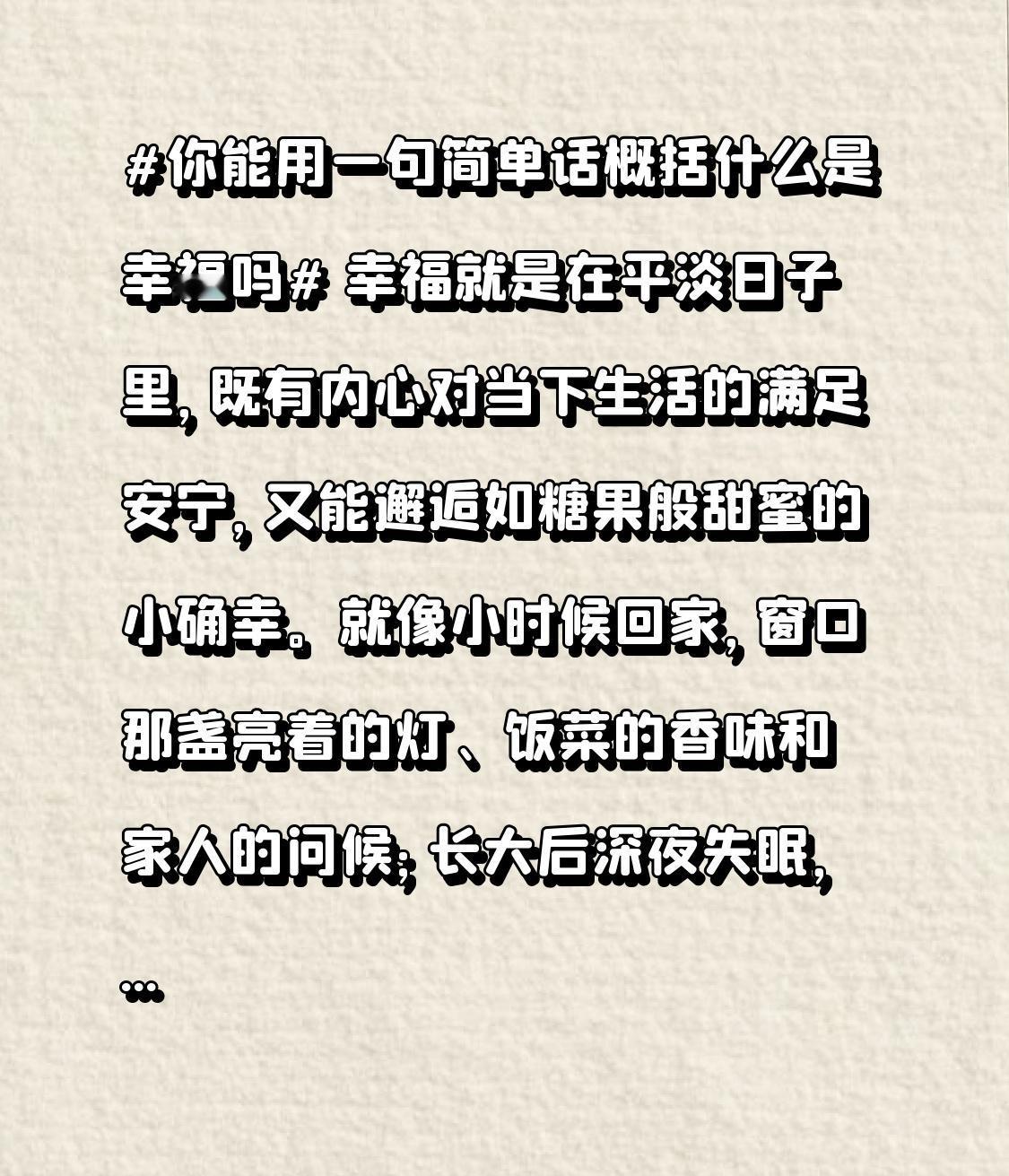 幸福就是在平淡日子里,既有内心对当下生活的满足安宁,又能邂逅如糖果般甜蜜的小确幸。就像小时候回家,窗口那盏亮着的灯、饭菜的香味和家人的问候;长大后深夜失眠,身边人迷迷糊糊伸来的手;工作后得到同事认可尊重。它不是年薪百万、豪车豪宅,而是辛苦一天后热乎的饭菜,寒冷冬日里一杯暖咖啡。幸福藏在生活点滴,用心感受,它一直都在。