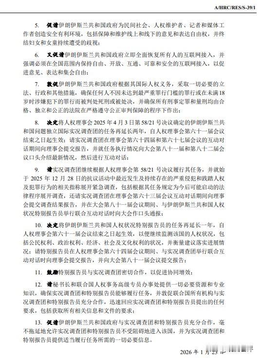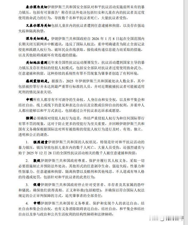 2月23日,联合国人权理事会第三十九届特别会议通过了“伊朗人权状况,特别是2025年12月28日的全国性抗议受镇压背景下的人权状况”,核心内容有两点,一是尊重伊朗的主权领土完整,反对对伊使用武力;二是谴责伊朗随意剥夺抗议者的生命健康权并敦促伊朗尊重基本人权。 对于这份中规中矩的提案,投票结果是,43个理事会成员中,25个赞同,14个弃权,7个反对。反对票包括古巴、印度、印尼、伊拉克、巴基斯坦、越南和X X,主要理由是“反对干涉内政、伊朗镇压的是暴乱分子、伊朗政府已经手下留情”。