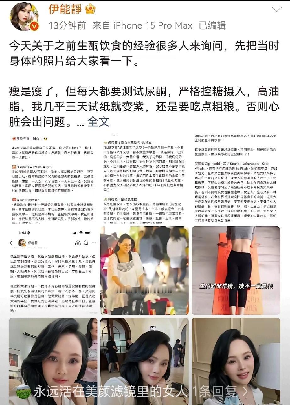 伊能静紧急发声!半年瘦到86斤险伤心脏,58岁坦言:健康比瘦重要 2月25日,伊能静发600字长文冲上热搜,自曝极端减肥经历,劝诫女生别盲目瘦身。她曾坚持半年生酮饮食,严控碳水瘦至86斤,却脸垮流失胶原蛋白,还险些影响心脏。 如今她放弃极端方式,改低糖温和饮食,体重稳定104斤。伊能静直言,熟龄女性不必硬追少女感,拒绝身材焦虑,与年龄和解才是最美状态。网友纷纷点赞:清醒又真实! 伊能静 伊能静人生感悟