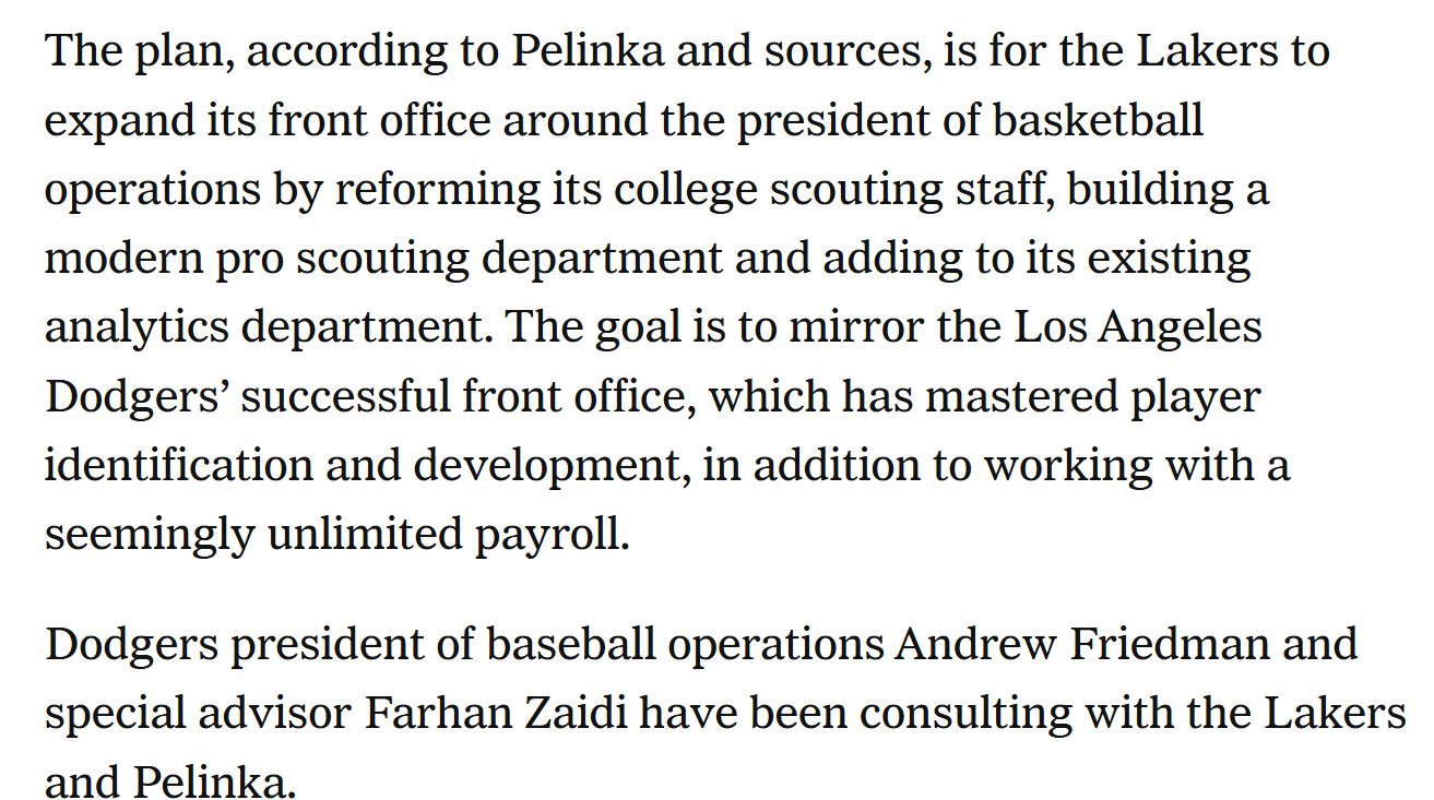 据佩林卡及知情人士透露,湖人的规划是围绕篮球运营总裁搭建更完善的管理层架构——改革大学球探团队、组建现代化的职业球探部门,并扩充现有的数据分析部门。球队的目标是复刻洛杉矶道奇队管理层的成功模式,不仅在球员挖掘与培养方面堪称标杆,还拥有近乎不受限制的薪资预算。道奇运营总裁弗里德曼和特别顾问扎伊迪目前已经在为湖人和佩林卡提供建议。