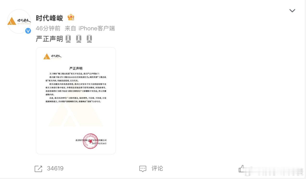 时代峰峻否认王橹杰私联时代峰峻辟谣王橹杰私联 26日,曝王橹杰私联引热议。随后发布严正声明,称王橹杰从未存在任何私联行为,相关话题和内容系恶意捏造,同时公司已取证,将依法采取法律手段坚决维权。