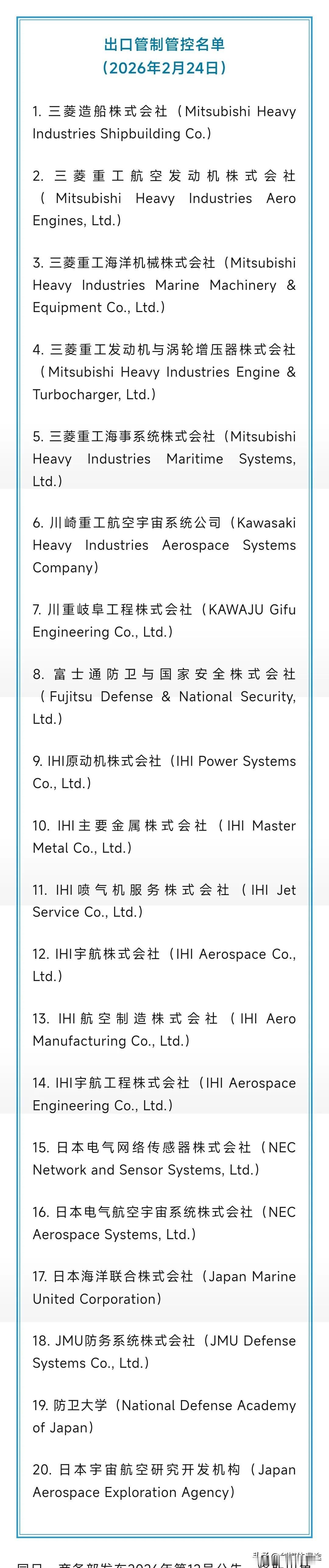 日本民众贴子表达:为什么中国能这么精准的查找到日本“军工企业”呢?日本一些网民对此更为感兴趣,并表达:中国太聪明了! 中国商务部在 2 月 24 日 发出通告:针对日本 20 家军工企业列入两用物项出口全面禁止 管制,另外 20 家日本企业列入“关注名单”(这是中国首次采用关注名单制度)。 除了日本一些政客表示反对并要求中方撤回管制举措之外,许多日本的网民更是表达 中国太聪明了,中国是如何查找到这些日本军工企业的?而这些企业许多日本国民都不清楚他们是在生产杀人武器的企业。然而中国竟然查得如此清楚 中国实在是太厉害了。 这也表明 咱们中国商务部的工作人员在过年期间都在努力工作,实在是辛苦。特别是类似日本国家没有一家是单独军工企业 ,被制裁的 20 家企业是“军民两用”的企业,即生产民用 也生产军用产品,这对于中方商务部工作人员核实查找来说更加的不容易。 所以日本的网民认为中国工作人员真的是太厉害 太聪明了!这足以说明,中国在军事方面对日本是一直紧盯着,虽然日本作为一个战败国,但日本始终没有反思与悔过 并不断的否认侵华战争 否认对中国犯下的滔天罪行,为此中国对日本不可能信任也不可能放松 时刻保持紧盯! 管制管控名单是 100% 覆盖日本军工全产业链的核心主体的,可以说所有的实体都是直接参与日本军事装备的研发,生产呀,运维的全流程的服务于日本军事实力的提升的。 1: 三菱造船,日本海洋联合株式会社等等,它都是日本海上自卫队主力驱逐舰,潜艇啊,准航母的核心建造或者配套方。是日本远洋作战能力的核心载体! 2: 日本航空航天和军用动力系统领域:包括像三菱重工航空发动机,川崎重工航空宇宙系统公司,IHI旗下的几家公司,覆盖了军用飞机、导弹、火箭动力等等这些核心环节的,它是日本军力扩张的一个心脏。 3: 防务及信息化作战包括富士通防卫与国家安全株式会社,这是负责日本自卫队指挥通信,雷达预警,电子战加密系统等等这些的核心的一些信息化装备的,可以说是现代作战体系的神经中枢。 所以日本的军工企业基本上都是被中国摸透了!能不厉害吗?