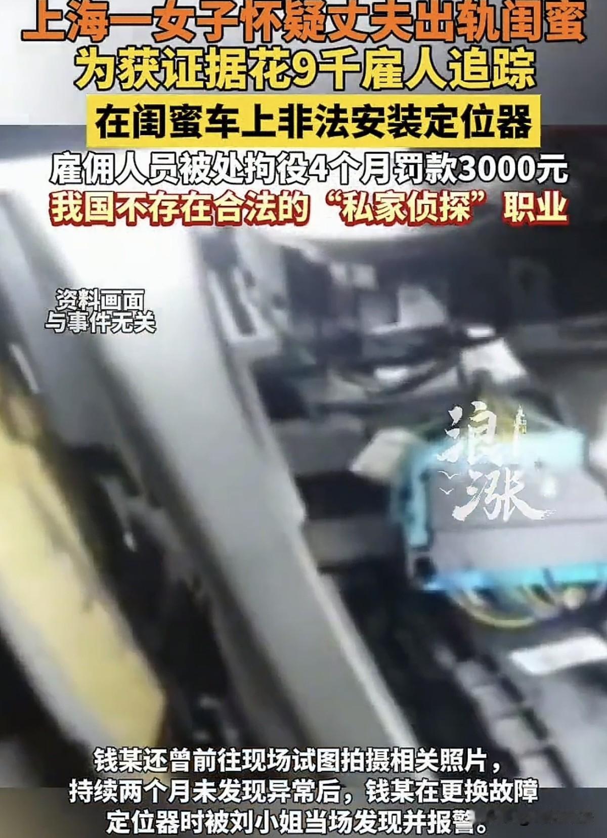 上海,陈女士怀疑丈夫婚内出轨闺蜜,付款9000元先后两次雇“私家侦探”丁先生、钱某在闺蜜刘小姐车上非法安装定位器追踪其行踪。在长达两个月的监视下,陈女士并未发现任何异样,而钱某却在更换故障定位器时,被刘小姐发现并当场报警。 原本常说的:防火防盗防闺蜜,只是一句大家的饭后调侃。但结了婚的陈女士是真听了进去。 一开始陈女士与其丈夫结婚时,夫妻之间的生活也算是有滋有味,时间一长,陈女士发现自己的丈夫好像不如之前对自己那样好了,时间长了便在心里有了怀疑。 虽然陈女士并没有在丈夫那里查到什么,但慢慢的陈女士通过观察和感觉,锁定了一名丈夫的“婚内出轨对象”。 这个人会是谁呢?正是陈女士的好闺蜜刘小姐。 原本陈女士与刘小姐是很要好的朋友,经常一起约着逛逛街、散散步之类的,这么长时间两个人也一直以闺蜜相称。 但这个时候,防火防盗防闺蜜这句调侃此刻在陈女士的耳旁不停的环绕,成为了她心里的一根刺。 陈女士再也无法忍受,她想当面与丈夫还有刘小姐问个清楚,但是抓人对质首先得需要证据。 这可怎么办呢?自己总不可能天天跟着他们吧?暴不暴露的先不提,自己哪里来那么多的时间呢?况且,万一自己真的暴露了,丈夫和闺蜜要是没什么那他们三个之间的关系可就是真的走到了尽头。 陈女士经过几天的思考,终于想出来了一个好办法,既然自己不能跟,那找个能跟的不就好了? 说干就干,第二天陈女士便找到了“私家侦探”丁先生和钱某,向他们说明情况和要求,让他们对刘小姐进行一段时间的跟踪,而自己就在家看着丈夫。 值得一提是,非法获取、出售或提供他人的个人轨迹,既使未造成其他伤害,也可能构成犯罪。 并且陈女士为了稳妥,还要求他们在刘小姐的车上安装了定位器。 这里需要注意的是,车辆位置、行踪轨迹属于公民的个人隐私,在未经他人知情、允许的情况下安装定位器,这种行为直接侵犯了他人对私密空间和信息的支配权利。 用定位器获取的行踪轨迹等信息属于法律保护的公民个人信息,非法获取此类信息情节严重时可构成刑事犯罪。 经过一段时间的跟踪,陈女士依旧一无所获,通过丁先生和钱某提供的线索和说法,自己的闺蜜刘小姐和自己的丈夫好像并没有任何异常。 但偏偏陈女士不信邪,又一次找到了钱某他们进行了新一轮的追踪。 时间一晃两个月过去了,让陈女士失望的是,自己经过了那么多的努力却还是没有任何证据能证明自己的丈夫“婚内出轨”了自己的闺蜜,恰恰在这时候安装在刘小姐车上的定位器也开始罢工出了故障。 钱某得知后立即前去更换故障的定位器,不巧的是,这次他当场被刘小姐抓住还报了警。 事后根据《刑法》第二百五十三条之一的规定。 钱某因非法获取、提供他人行踪轨迹信息情节严重,构成侵犯公民个人信息罪被判处拘役四个月缓刑四个月并处罚金3000元。 而陈女士和丁先生则进行另案处理。 对此,各位有什么看法?欢迎大家留言交流。