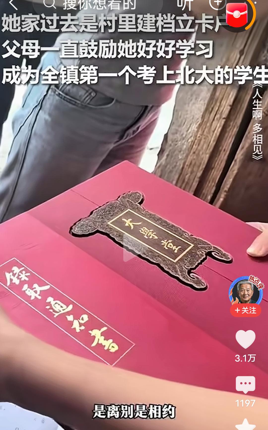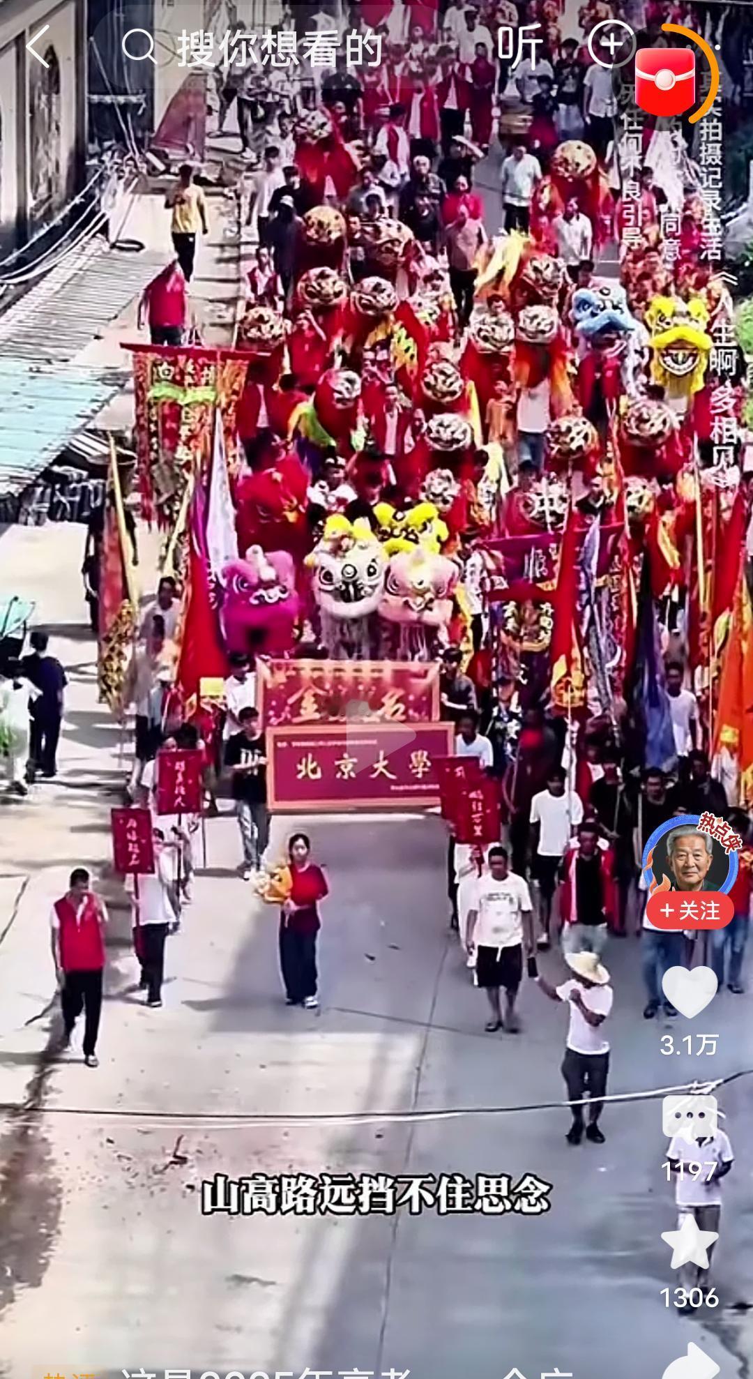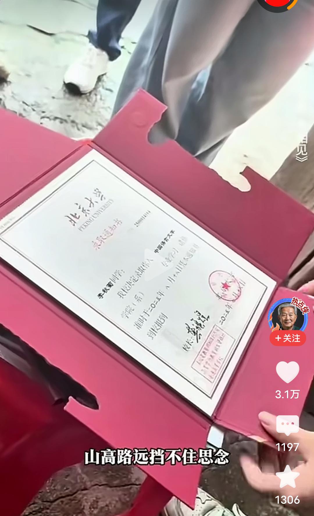 女孩在割牛草回家的路上,接到了北京大学的录取通知书! 这是2025年发生在广西的真实一幕,这个女孩的父母都是老实巴交的农民,是村里建档立卡户,家庭生活困难,她也成为全镇第一个考上北大的学生。 平常父母一直鼓励她好好学习,她也努力勤勉,家里的墙上挂满了各种各样的奖状,可见这个女孩平常是多么的优秀。 接到北大录取通知书后,镇里锣鼓喧天,鞭炮齐鸣,舞龙庆祝,鲜花,牌匾,掌声,整个镇子热闹非凡,比过年还要热闹,真的是光宗耀祖! 这可真是: 无人扶我青云志,我自踏雪至山巅。 海到尽头天作岸,山登绝顶我为峰。