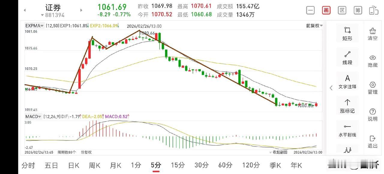 聊聊证券板块(2026.2.26) 今天证券板块延续了一个下跌走势,那么它目前还在日线一笔的调整过程中,调整并没有结束,还需耐心等待,操作股票时最关键的是要把心沉下来,证券虽然很渣,但它一定是第一个跑向终点的板块,十年磨一剑,终有它起势的一天。 1.从30分钟图一上看,目前正在走中枢离开段,该离开段还没有出现5分钟中枢,所以截止上午收盘,是无法判断它是否结束的,只能继续持股观察。 2.从5分钟图二上看,下午将迎来反弹,由于昨天下午到今天上午,下挫力度比较大,下午的反弹应该会比较弱,是一个构建5分钟二卖或者5分钟中枢的过程,所以这里并没有好的操作级别,宜考虑继续观察为主,等出现5分钟中枢后,再考虑是否有操作的机会。 总之,日线一笔还没调整完成,那么在操作上就不能操之过急,宜继续等待。集卡领红包 证券板块解析