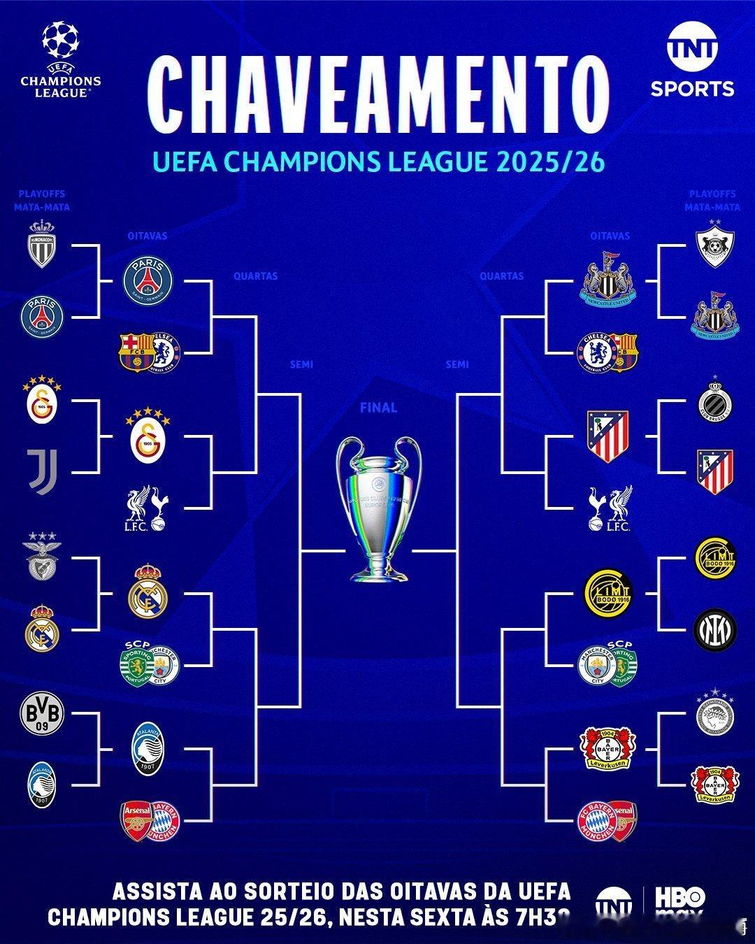淘汰赛附加赛晋级8队:马竞、勒沃库森、纽卡、博德闪耀、皇马、巴黎、亚特兰大、加拉塔萨雷