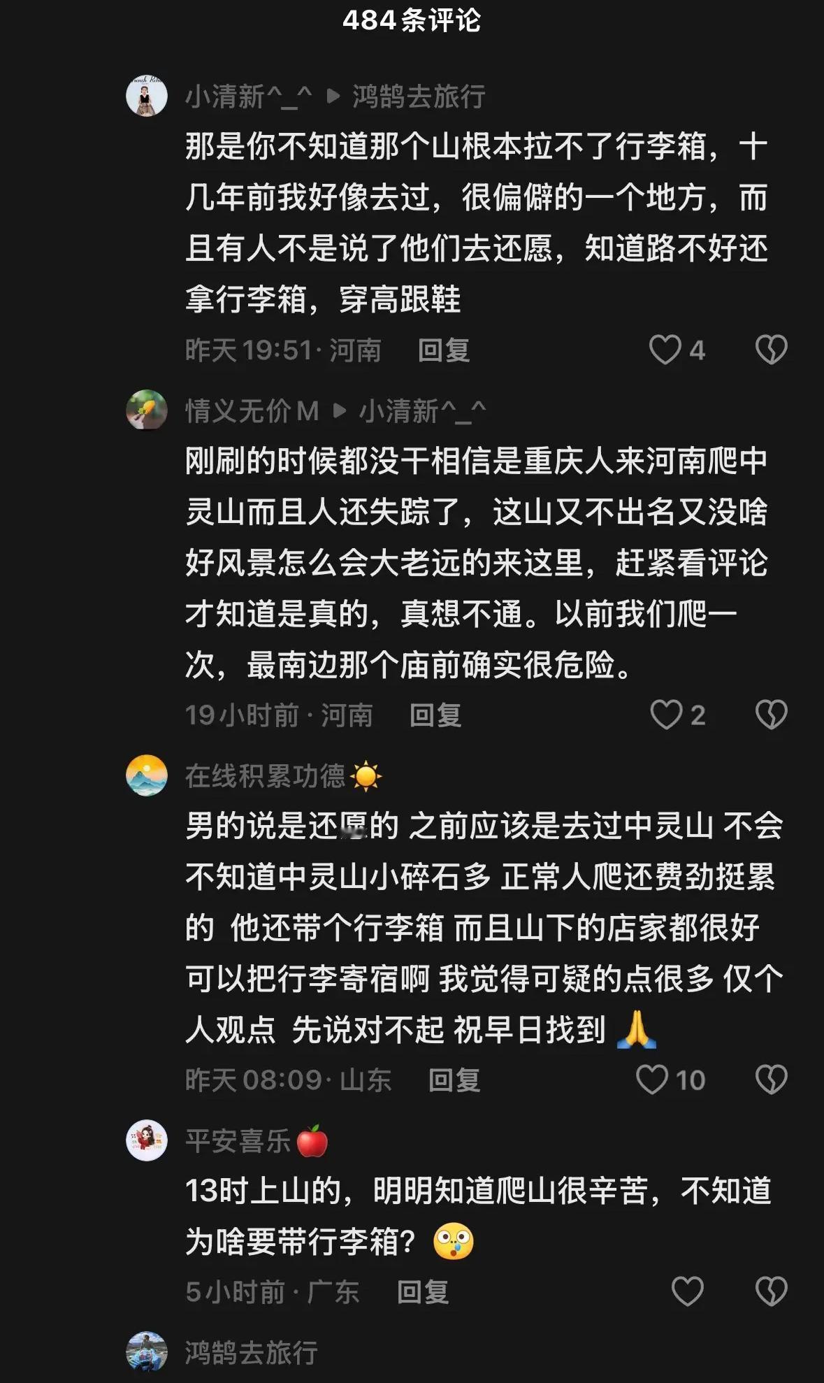 看来:坠亡女子冥冥之中有预感,亲戚称她上山就一直说怕什么,那么她到底怕什么呢? 亲戚称,一家人去还愿,那么应该以前来过,那么肯定知道路况,而且还说,打雷被吓到了,才去中灵山,上去后一直说怕什么! 她老公还说,她没有带手机,精神可能出了问题! 亲戚还说,安阳宫附近,刘美歇脚,丈夫照顾孩子,回头找老婆就不在了,晚上10点,没手电,没路灯不可能下山。 但目击者称:爬山时遇到一家人,女子光脚走在前面,孩子在中间,男人拉着行李箱压后。 第二次碰见男子问他们是否看到个光脚的女子,男子说孩子在山地车能到达的位置等他们,行李也放在那里。(时间约下午5点) 民宿老板也说,看到男子带着两个孩子,问他们要不要车,他们摇头说不要! 就如那位老父亲说,希望她女儿走得明明白白!