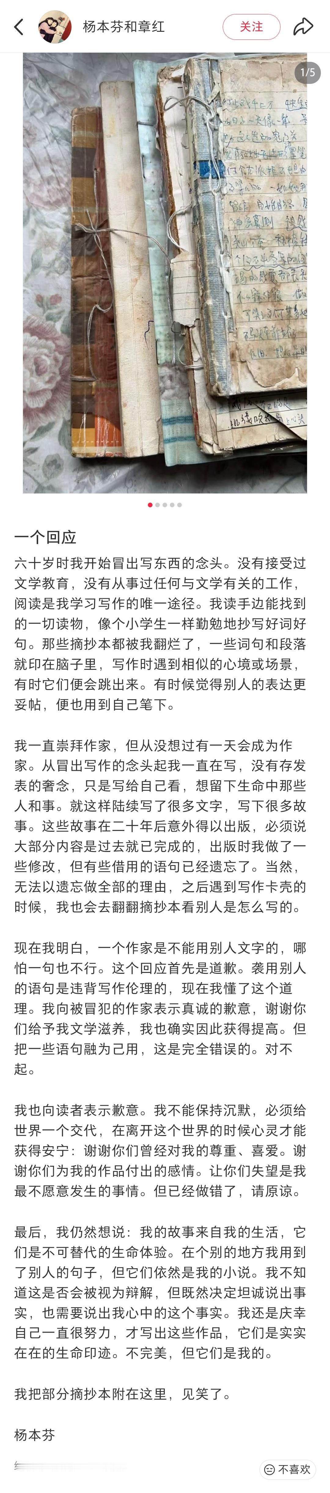 【杨本芬回应】近日,《秋园》《浮木》《我本芬芳》《豆子芝麻茶》作者杨本芬通过个人账号发布长文,回应连日来网友指控的文字雷同争议。她说,阅读是自己学习写作的唯一途径,曾在摘抄本写下许多好词好句,那些摘抄本都被翻烂了,一些词句和段落也印在脑子里。“这个回应首先是道歉。袭用别人的语句是违背写作伦理的,现在我懂了这个道理。”她向被冒犯的作家以及读者表示歉意,将一些语句融为己用,是完全错误的。“最后,我仍然想说:我的故事来自我的生活,它们是不可替代的生命体验。在个别的地方我用到了别人的句子,但它们依然是我的小说。我不知道这是否会被视为辩解,但既然决定坦诚说出事实,也需要说出我心中的这个事实。我还是庆幸自己一直很努力,才写出这些作品,它们是实实在在的生命印迹。不完美,但它们是我的。”