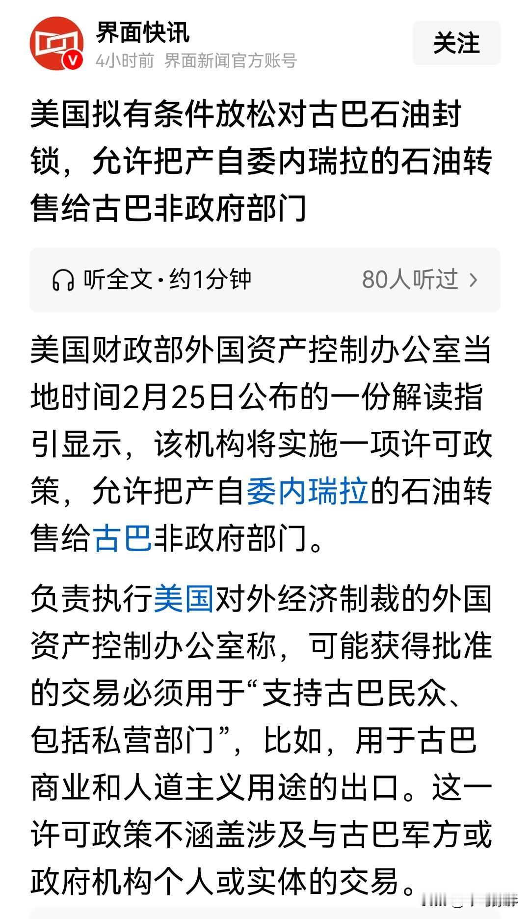古巴开火,美国立马服软! 据哈瓦那消息,2月25日一艘美国快艇窜入古巴领海并开火,古巴舰艇开火还击,致美国4人死亡6人受伤。 最新消息,美国财政部拟有条件放松对古巴石油封锁,允许把产自委内瑞拉的石油转售给古巴非政府部门。