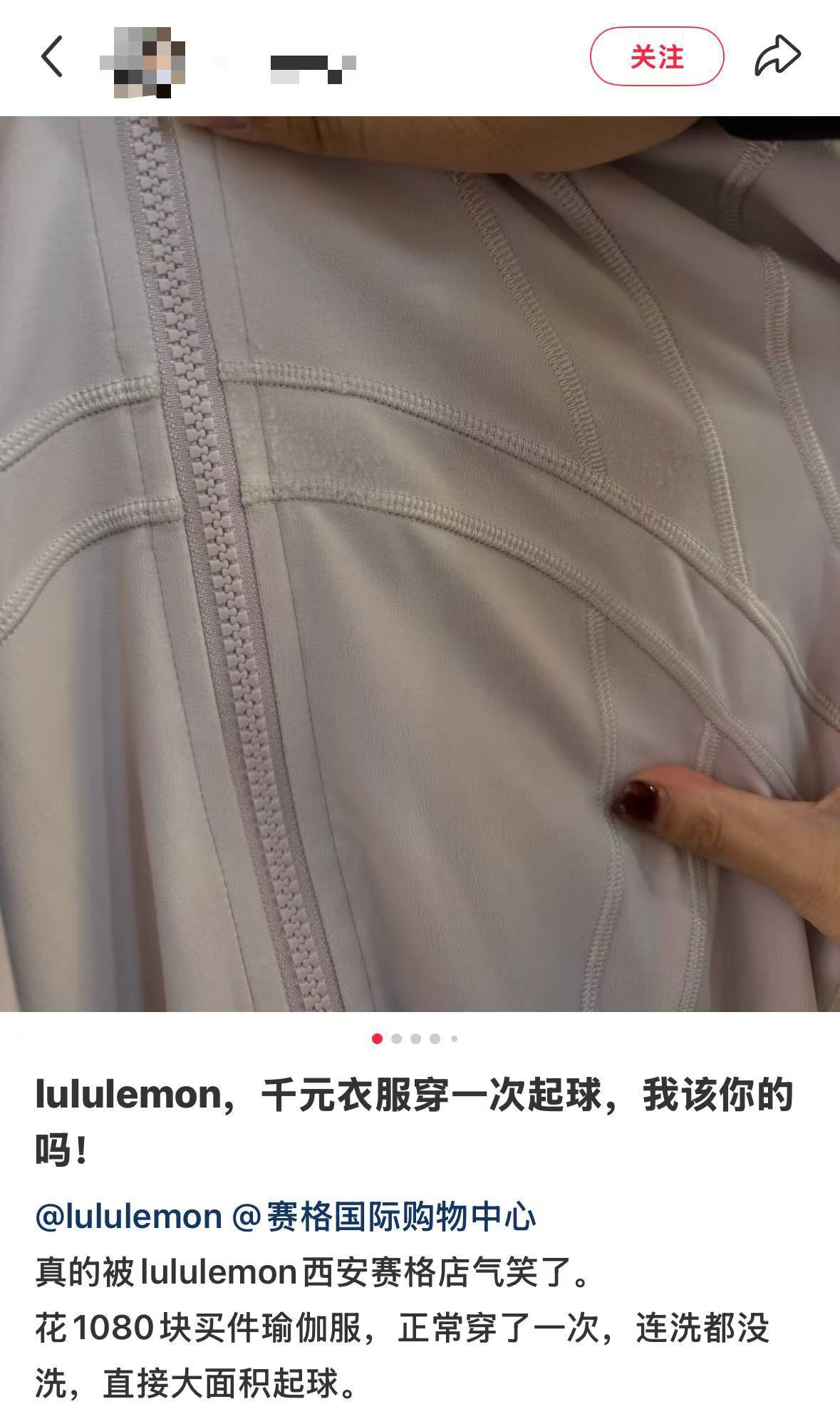 发帖人王女士告诉极目新闻记者,她于2月4日在西安雁塔区赛格购物中心lululemon门店购买了一件价值1080元的Define长袖外套。2月21日她第一次穿上新衣,在外套了一件跑步外套,结果当晚回家,她发现胸前两处及袖口起球,当天仅穿着约10小时。“第一次穿就起球,我觉得是产品质量问题。”王女士表示,起球位置在胸前,不存在故意摩擦。目前,衣物吊牌已拆除,但未进行水洗。
