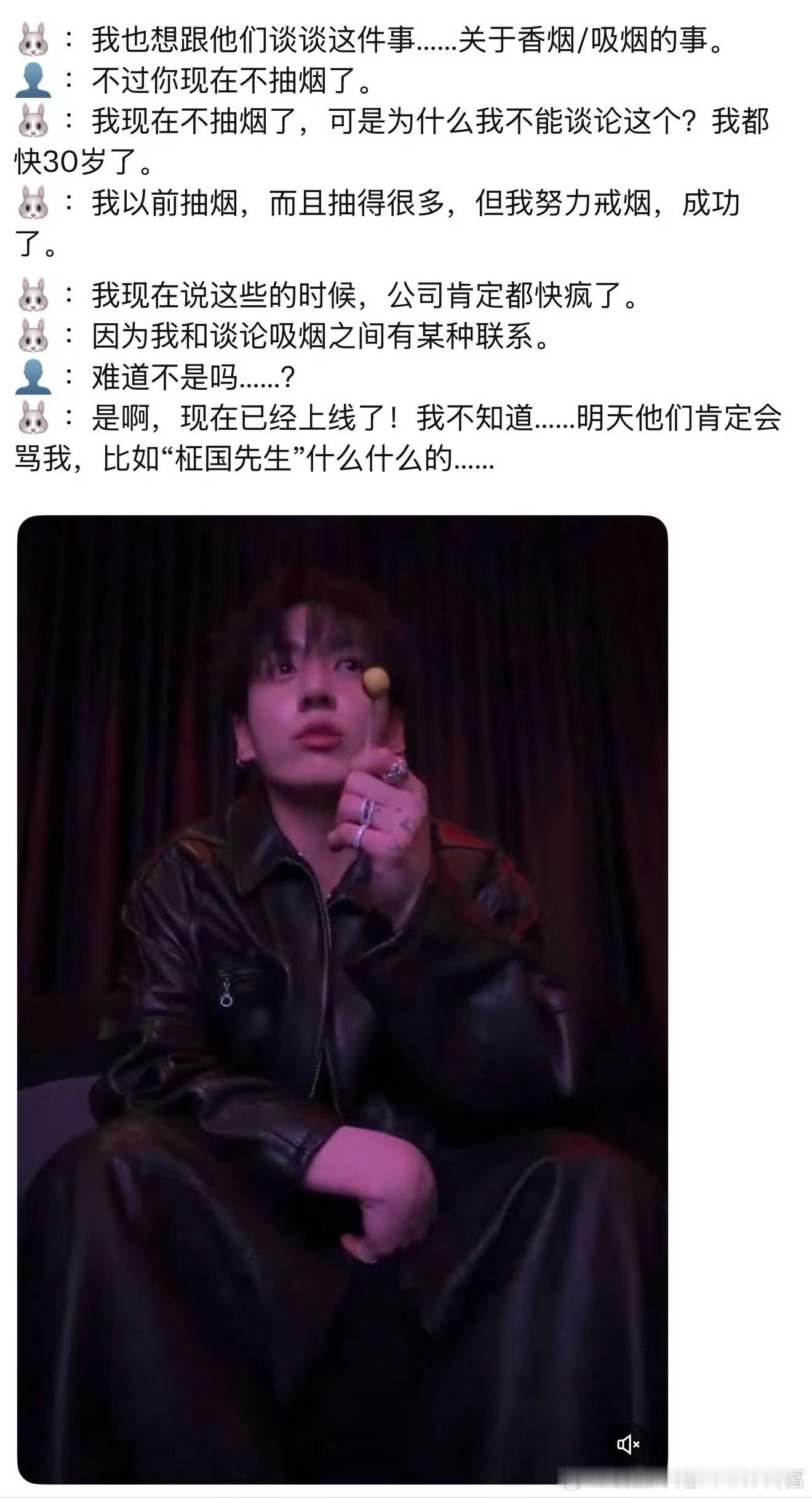 不知道田柾国这场直播啥意思,就是坦诚自己抽烟但是已经戒掉了?看起来像喝多了,剖析完自己又后悔开直播了田柾国后悔开直播