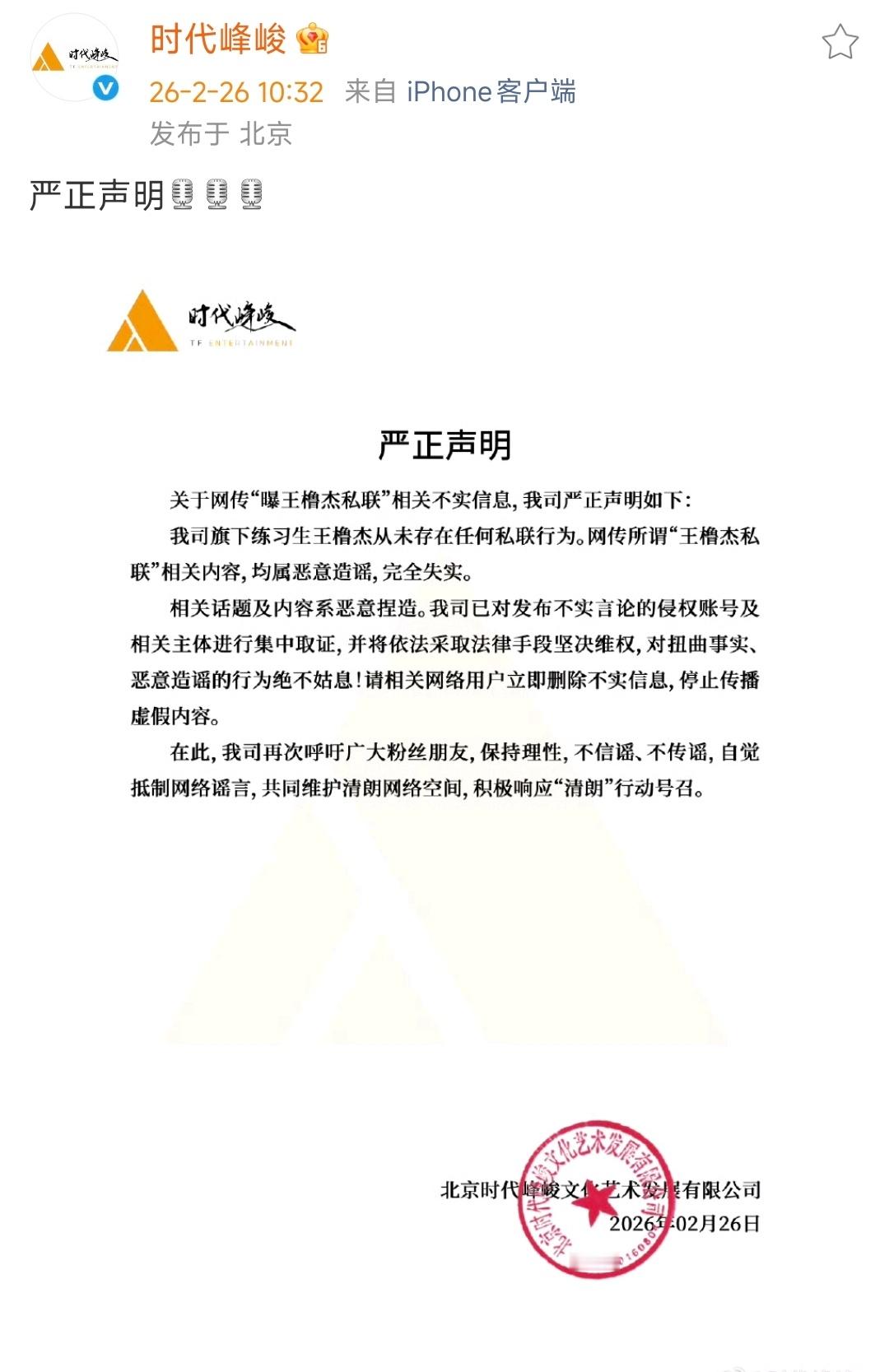王橹杰否认私联时代峰峻澄清王橹杰私联 虽迟但到,时代峰峻澄清王橹杰私联