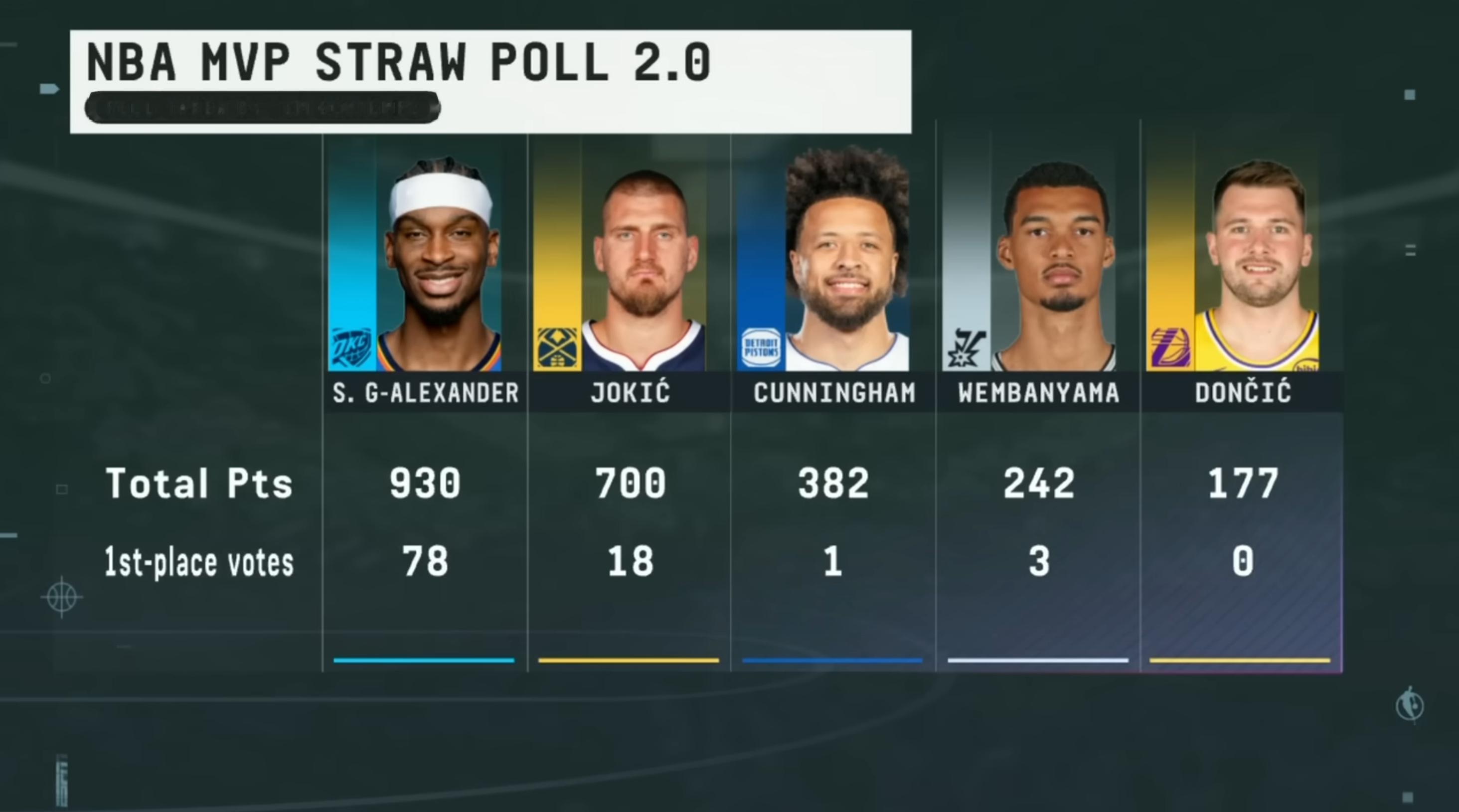 ESPN邀请100名记者进行本赛季常规赛MVP第二次非正式民意调查,亚历山大获得78张第一选票,是唯一一位获得全部选票的球员,总分930排名第一。约基奇、坎宁安、文班亚马分列二至四位。湖人球员东契奇没有获得一张第一选票,得到两张第二选票,总分177排名第五。
