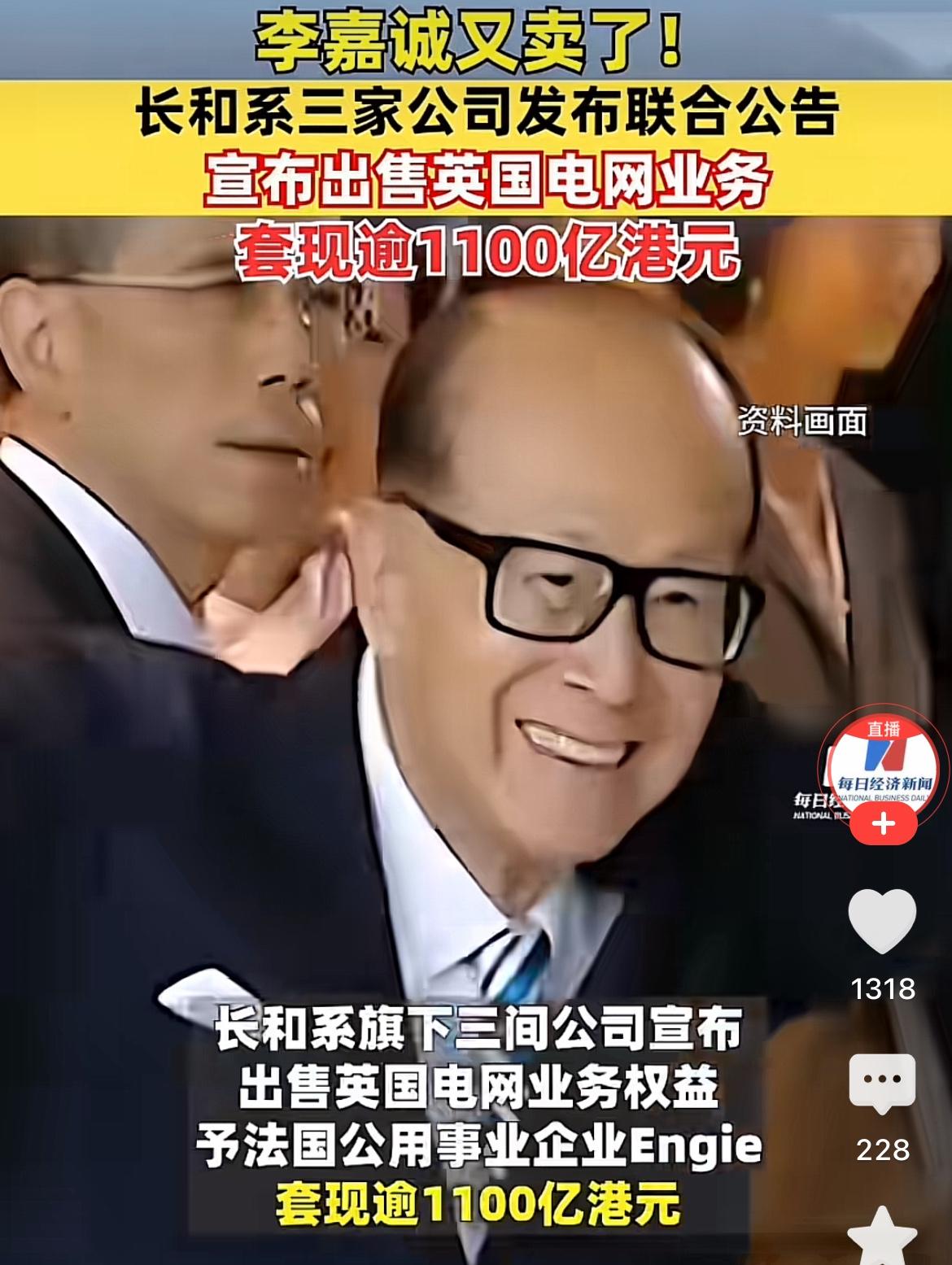 李嘉诚可能嗅到了危险的信号,果断卖掉了英国电网公司100%股权,套现逾1100