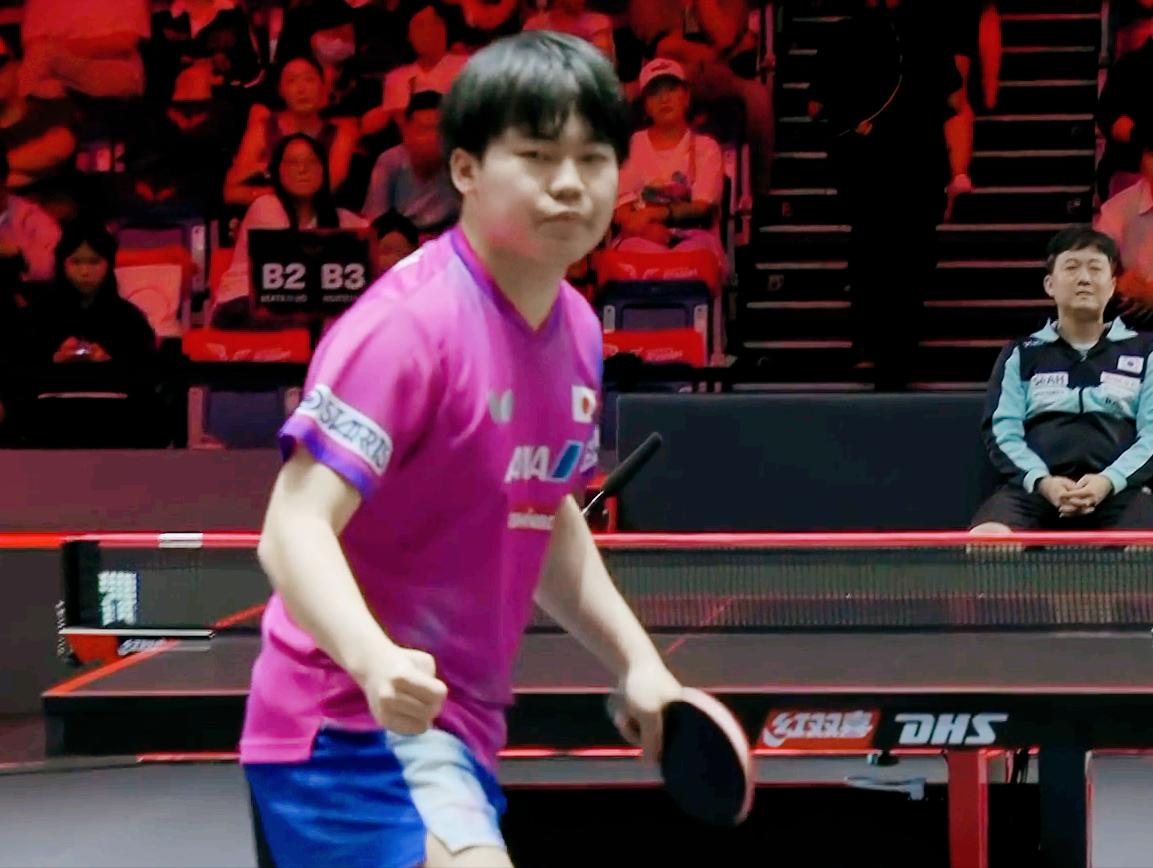 不好!松岛辉空又涨球了! 程靖淇说:松岛辉空反手越来越稳定了, 今天松岛的反手也是很强, 第一局 松岛辉空一直领先, 但是张禹珍8:6反超比分后, 松岛辉空又靠反手连拿4分, 最后也是反手拉直线, 11:9拿下张禹珍。