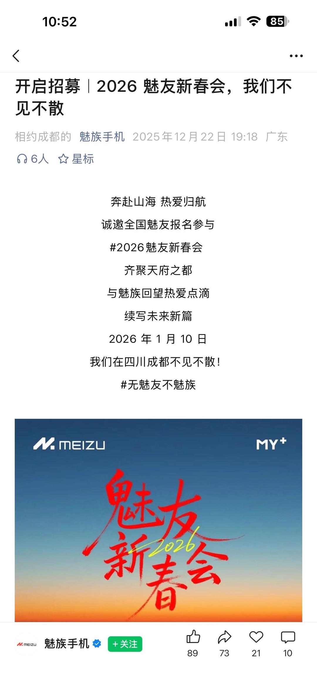 记者注意到,魅族官网仍在正常售卖手机,官方微博@魅族科技也在正常更新,置顶内容仍是去年9月上新的旗舰手机。不过,魅族手机官方微信公众号的更新停留在去年12月22日,当天发布了一篇邀请全国“魅友”报名参与“2026魅友新春会”的文章,文中写道:“与魅族回望热爱点滴,续写未来新篇,2026年1月10日,我们在四川成都不见不散!”