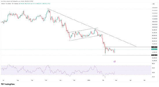 比特币隔夜大涨6%回升至68000美元。据图所示,64000美元附近形成初步的止跌反转形态,70000-72000可能是多头的下一个目标区域,但由于处于反弹初期且宏观环境存在较大变数(关税、伊朗、流动性等),需要留意冲高回落的风险。在彻底突破上方阻力之前,价格或持续低位震荡。