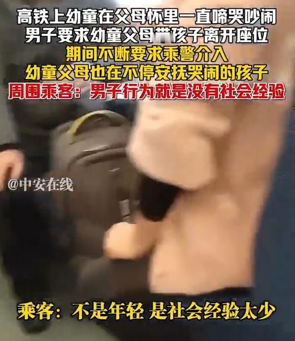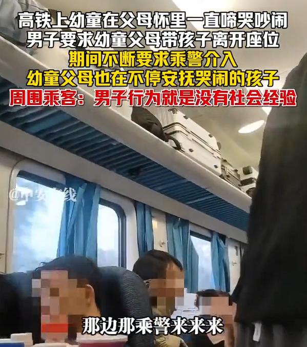 高铁幼童哭闹男子要求父母带离,从视频中足以看出,男子盛气凌人大呼大叫地喊“乘警,来来来”,并痛斥孩子家长“这你爸妈是干啥的”。 其实,视频中,孩子的父母一个抱着哄着,一个轻拍着孩子安抚情绪,全程孩子父母都没有一句话,都是在哄孩子,毕竟孩子太小了,只有一岁左右的样子,在公共场合哭闹,具有不可控性,实属正常,这个时候多一些理解和包容,也是成年人成熟的一种表现,但该男子并没有任何包容之心。特别是在孩子停止哭闹以后,该男子仍然没有退让,这就有点得理不饶人了,这种“情绪暴力”要不得。 就连周围的乘客也认为,男子不是年龄的问题,而是社会经验太少。既然孩子已经停止哭闹了,还大喊大叫要求父母带离幼童,是不是有些许霸道了呢? 如果是孩子打闹,父母不管,男子出面制止我认为是在情理之中的,幼童的父母一直在哄孩子,而且,这个时候,父母心里其实也是着急的,怕影响别人,只是孩子太小,或者身体上心理上不舒服,只有哭闹一种情绪,如果是当过父母的人,有过孩子的人,往往都是可以理解的。 我认为,在公共场合,过于“咄咄逼人”,未必是解决问题的最佳方式。