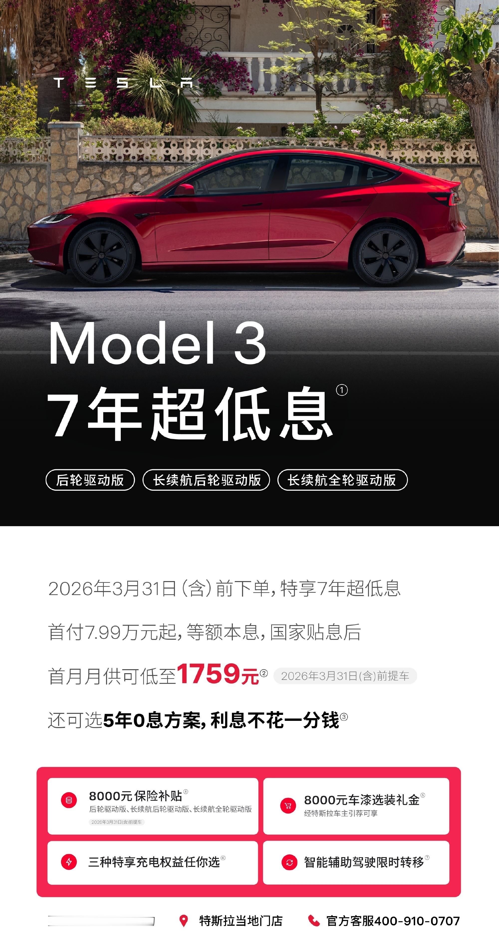 【特斯拉中国促销持续加码:特斯拉全系车型5年0息 可选7年超低息】特斯拉中国今日宣布,3月31日(含)前下单,可享受7年超低息贷款购车政策。✅-Model 3 首付 7.99 万元起,首月月供可低至 1759 元;✅-Model Y 首付 7.99 万元起,首月月供可低至 2188 元;✅-Model Y L 首付 9.99 万元起,首月月供可低至 2849 元。上述三款车型同时提供 5 年 0 息贷款方案供消费者选择。