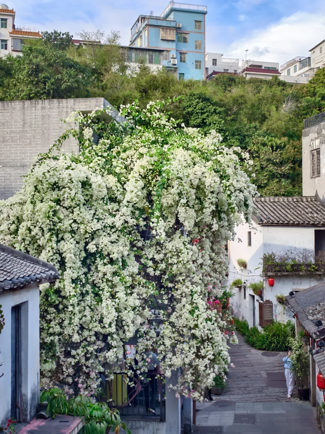 3️⃣ 白色三角梅楼梯,在古镇南门的巷子里,这里可以走上楼梯和三角梅合照,适合拍人像