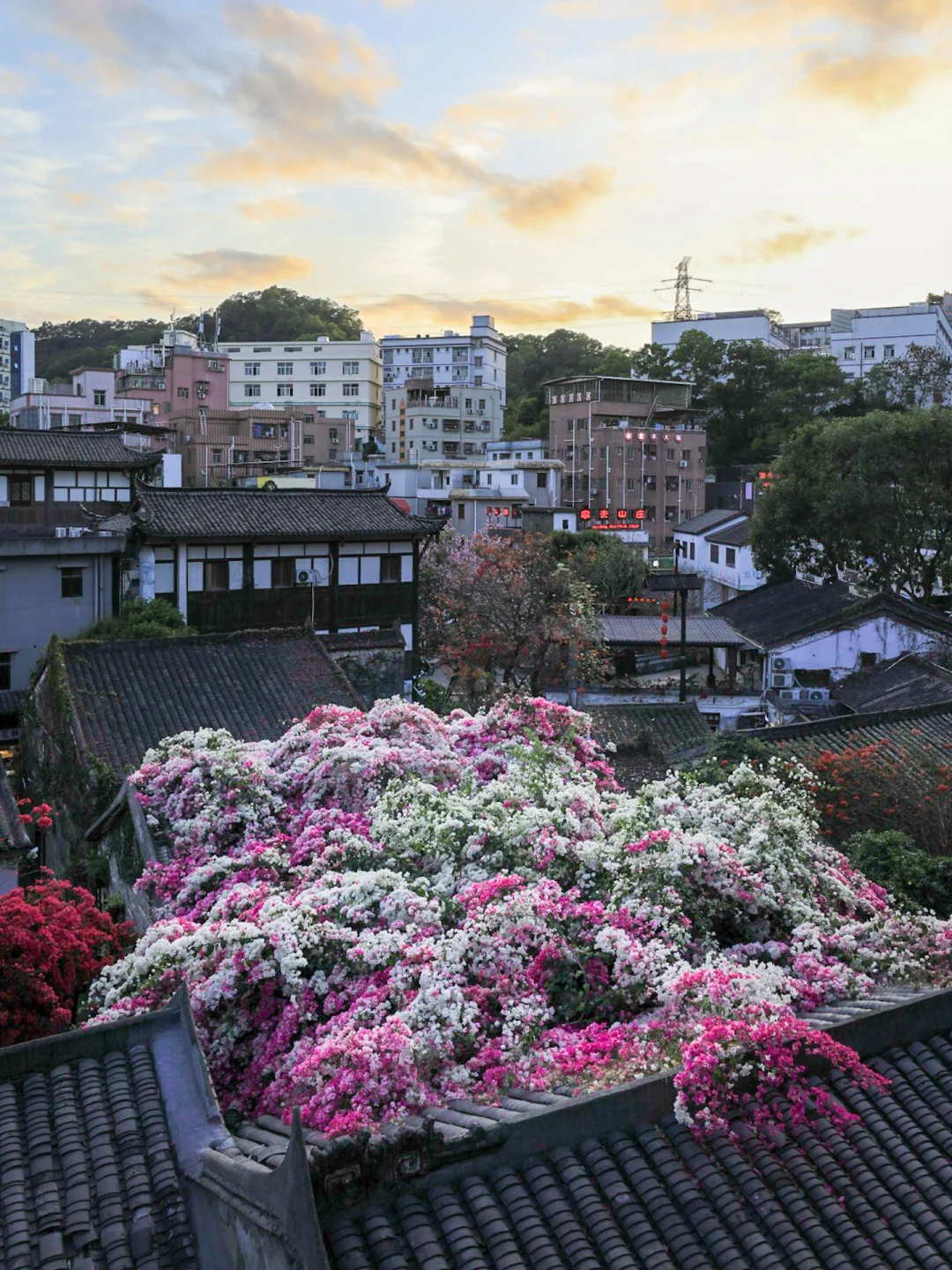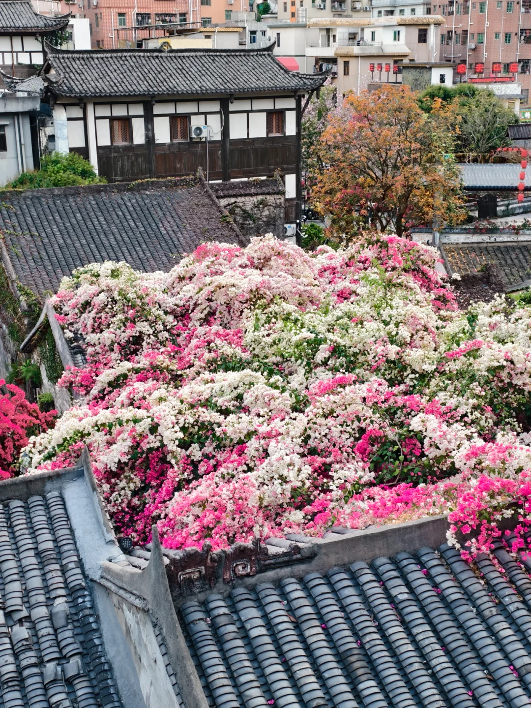 今年天气暖和,花期比往年早了半个月,甘坑古镇的三角梅已进入盛花期🌸,周末天气好就可以冲~
