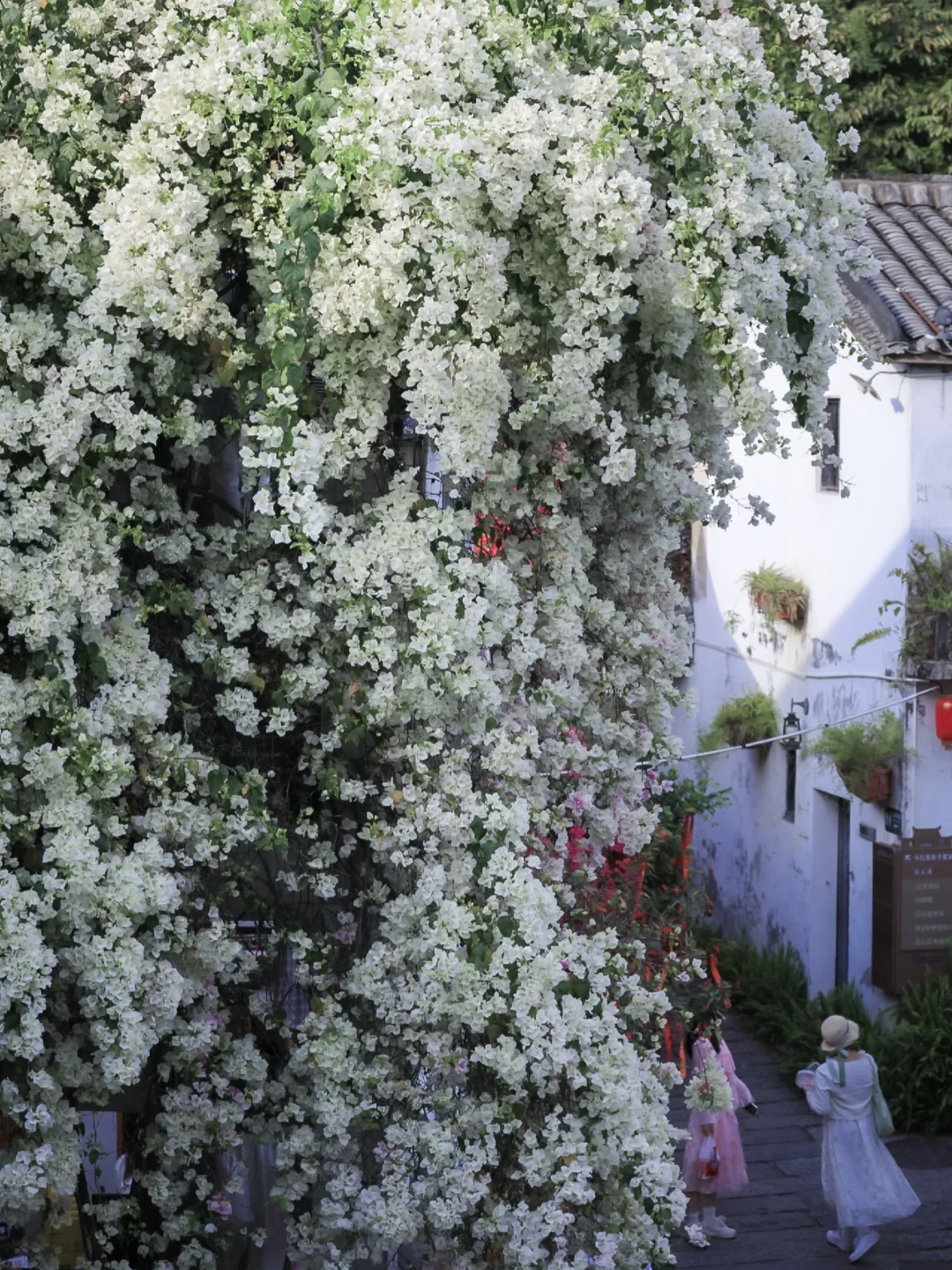 1️⃣ 白色三角梅瀑布和仕女图,位于珑月坊旁