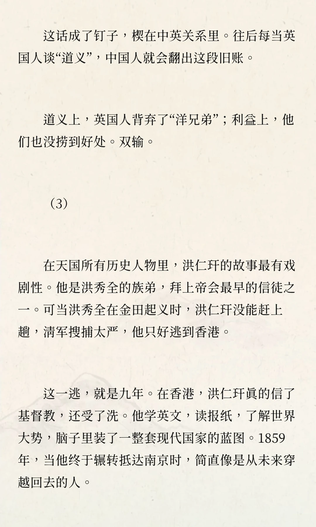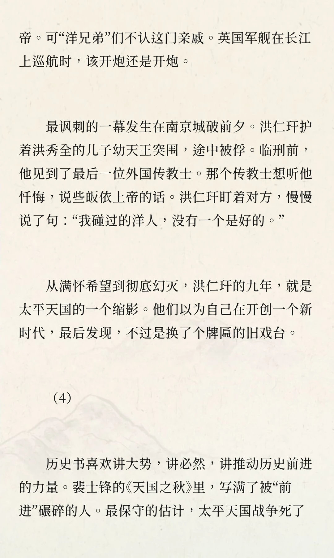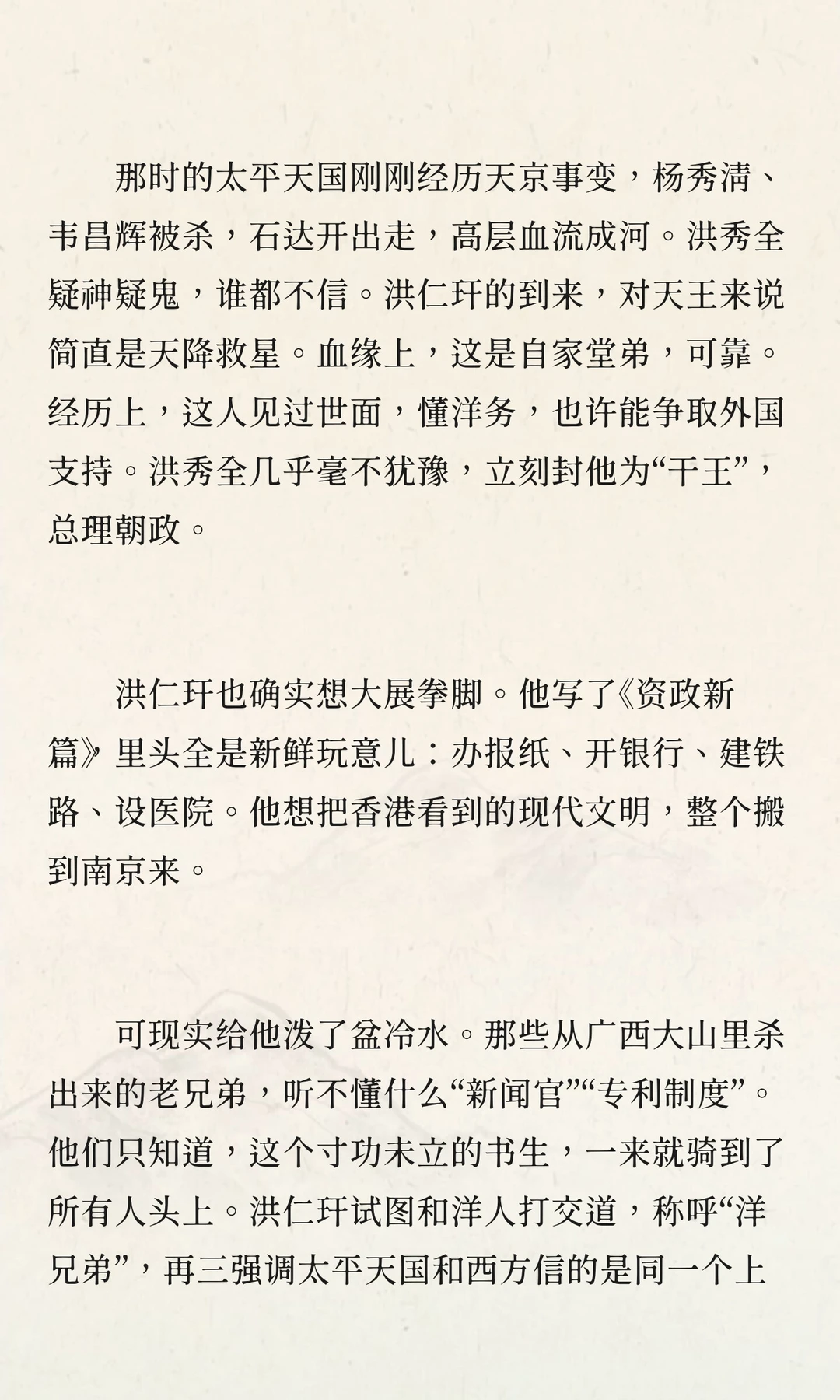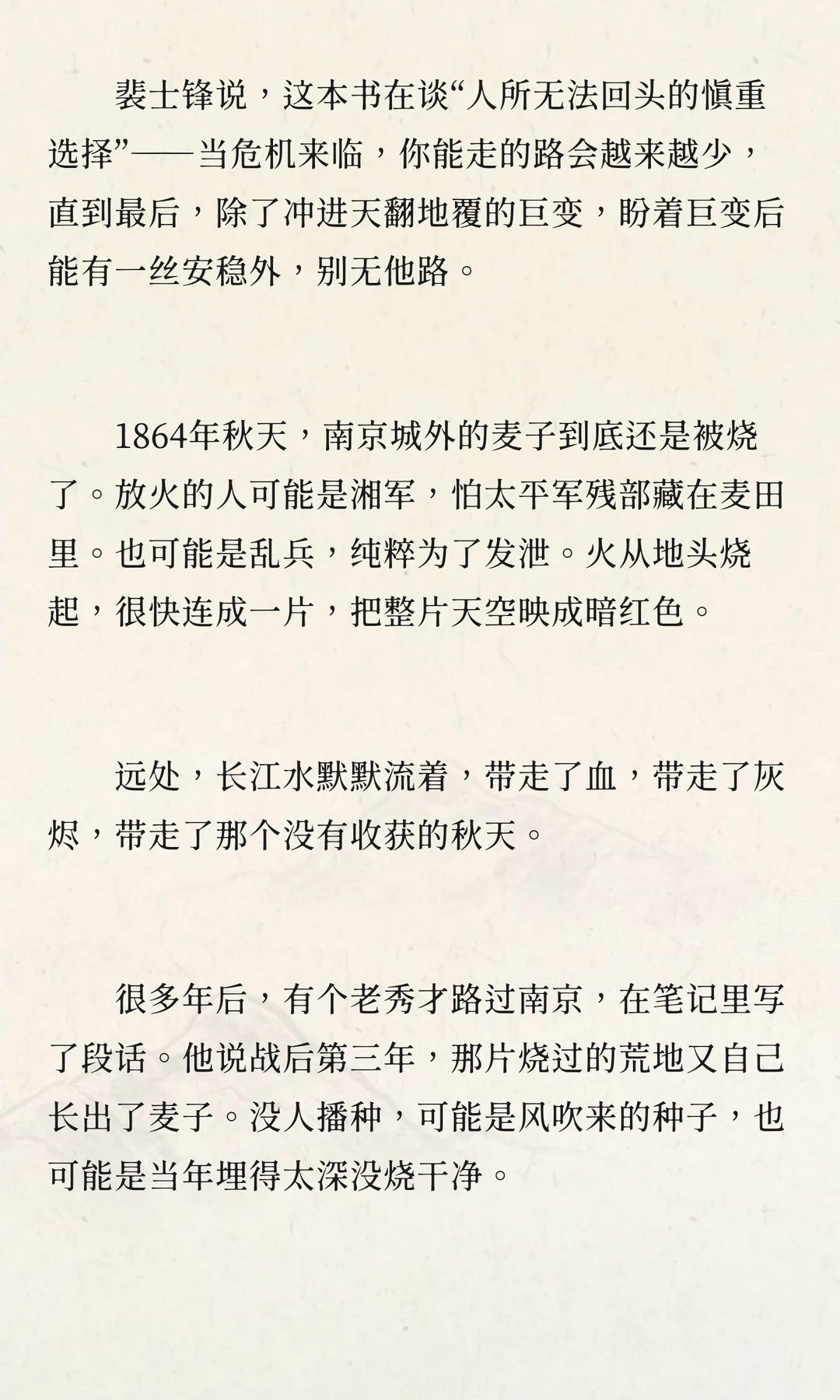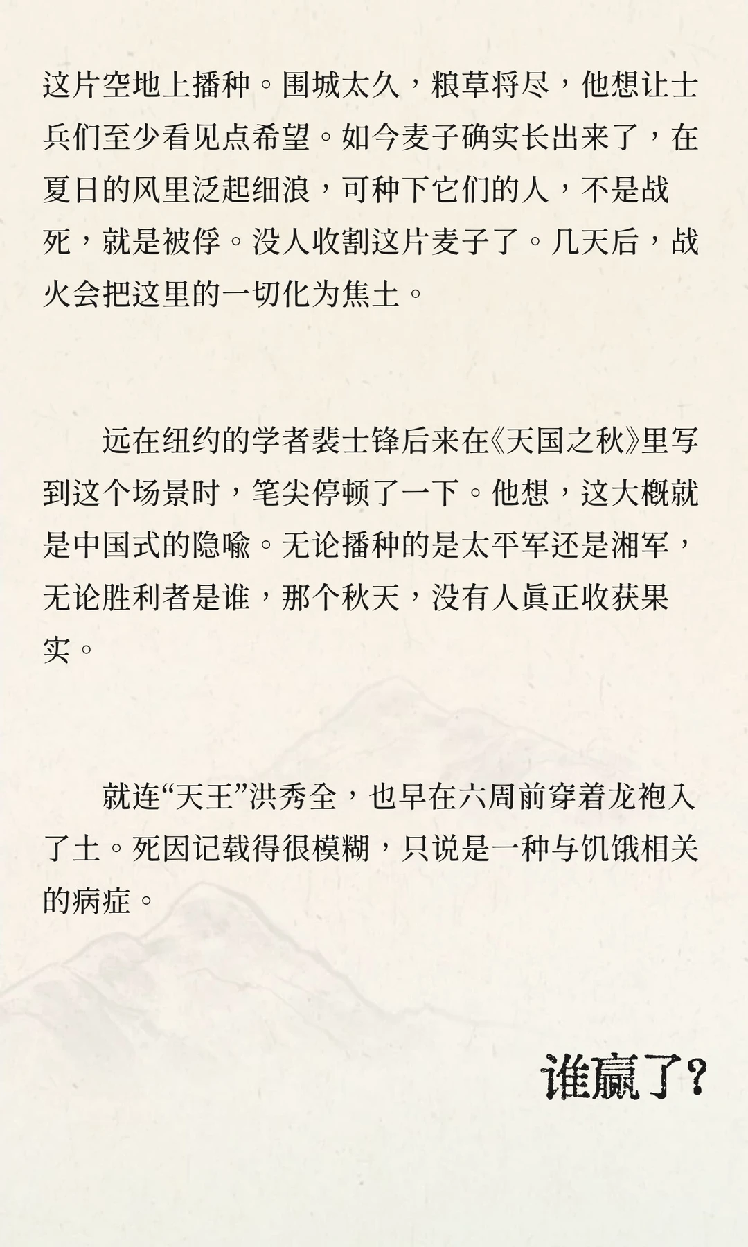 1864年7月,曾国荃的湘军攻破南京,太平天国失败。这场战争导致两千万人死伤,战后可谓是百废待兴。洪仁玕的《资政新篇》未能实施,太平天国最终走向崩溃,土地虽长出麦子,但历史的创伤难以愈合。