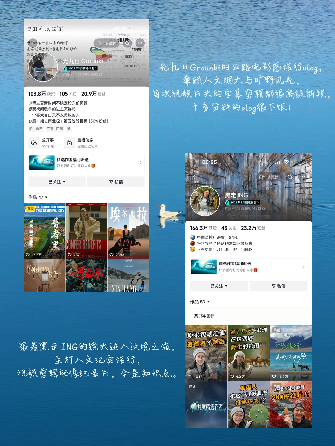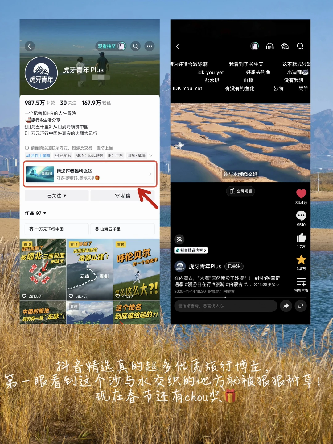 这次跟着作者虎牙青年的攻略成功打卡乌海,真的很惊艳的一次旅行~在小选还有超多优质的旅行作者,跟着黑走ING的镜头进入边境之旅,主打人文纪实旅行,视频剪辑就像纪录片,全是知识点。还有光九日Grounki的公路电影感旅行vlog,兼顾人文烟火与旷野风光,每次视频片头的字幕剪辑都很高级新颖,十多分钟的vlog太下饭了!现在春节期间还有🎁快去试试手气~