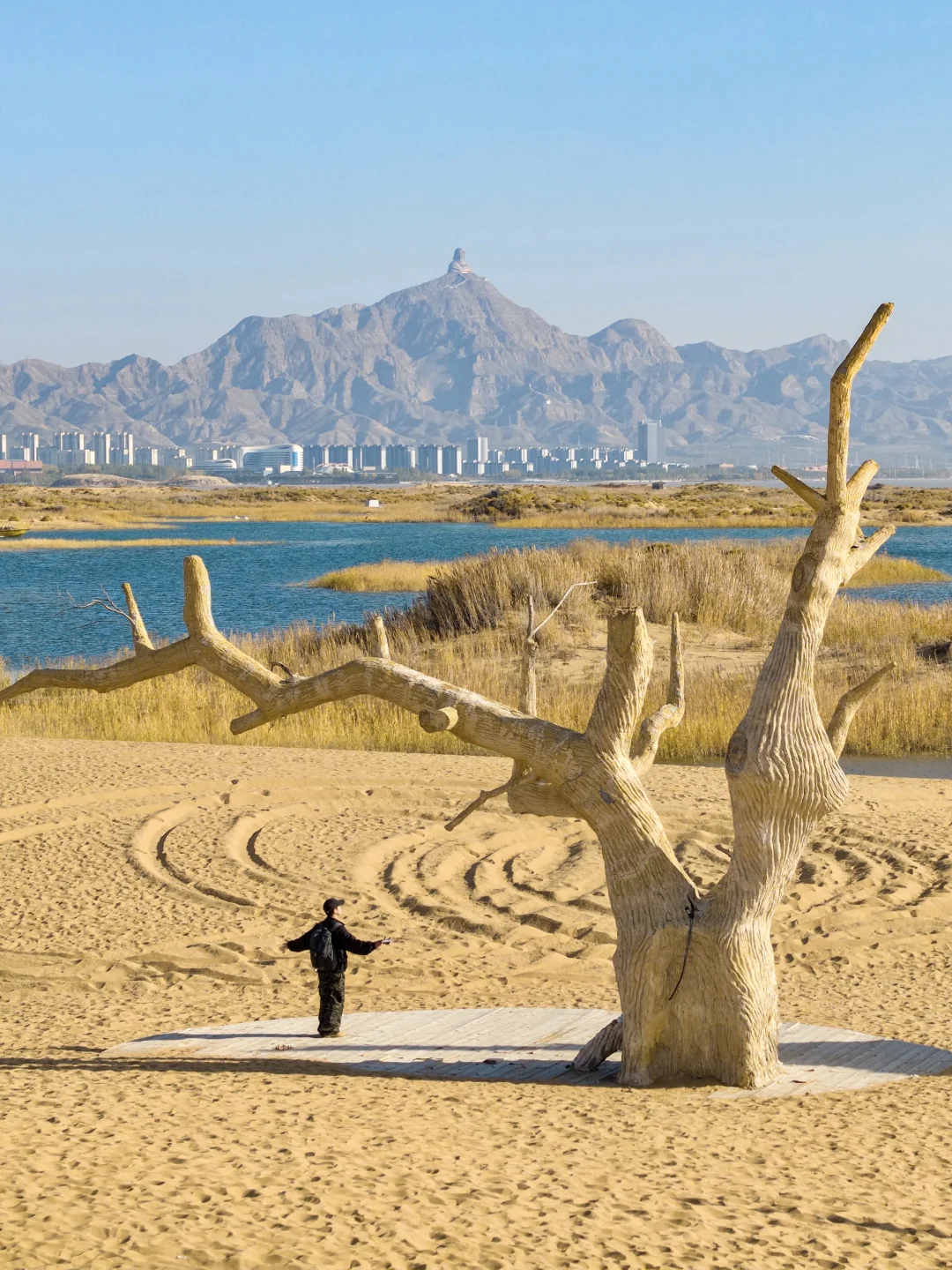 因为水利工程而形成的人工湖,沙与水的交织,勾勒出风的形状。冬天湖面结冰,更有冰封沙漠的奇景。面积是杭州西湖的18.5倍大,主要有沙漠公路,网红枯树等出片打卡点,独特的沙漠湖泊景观,航拍会更加震撼!