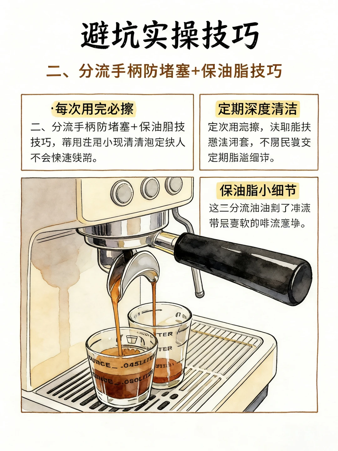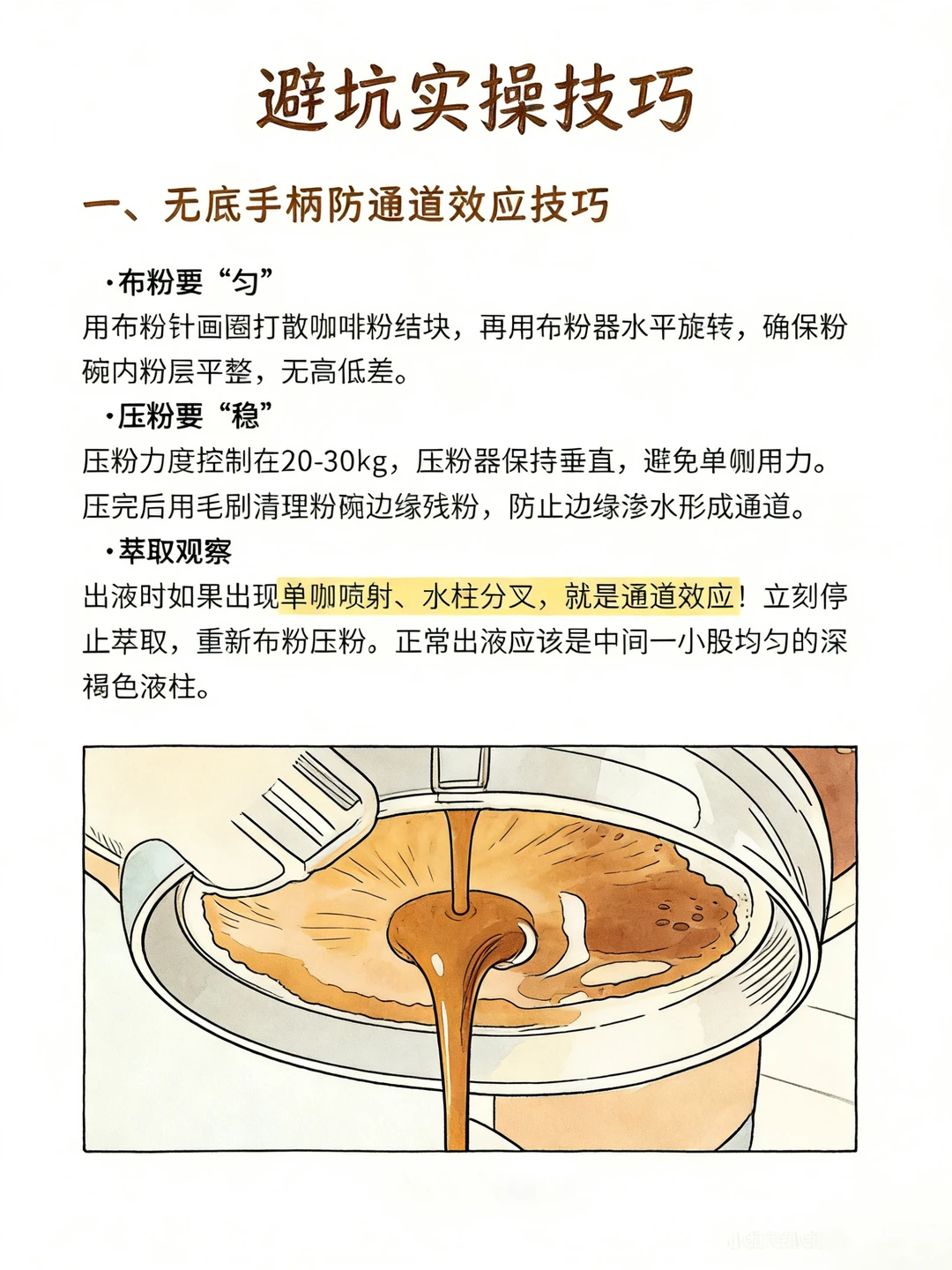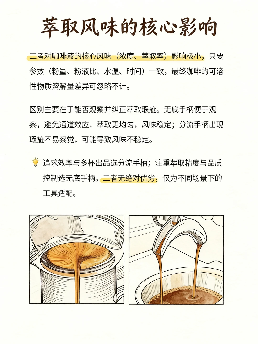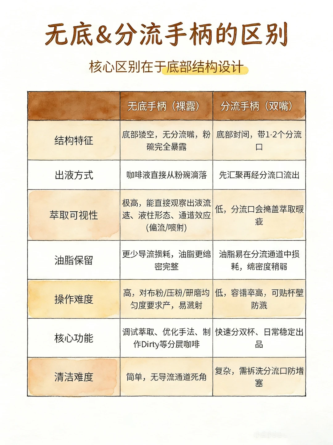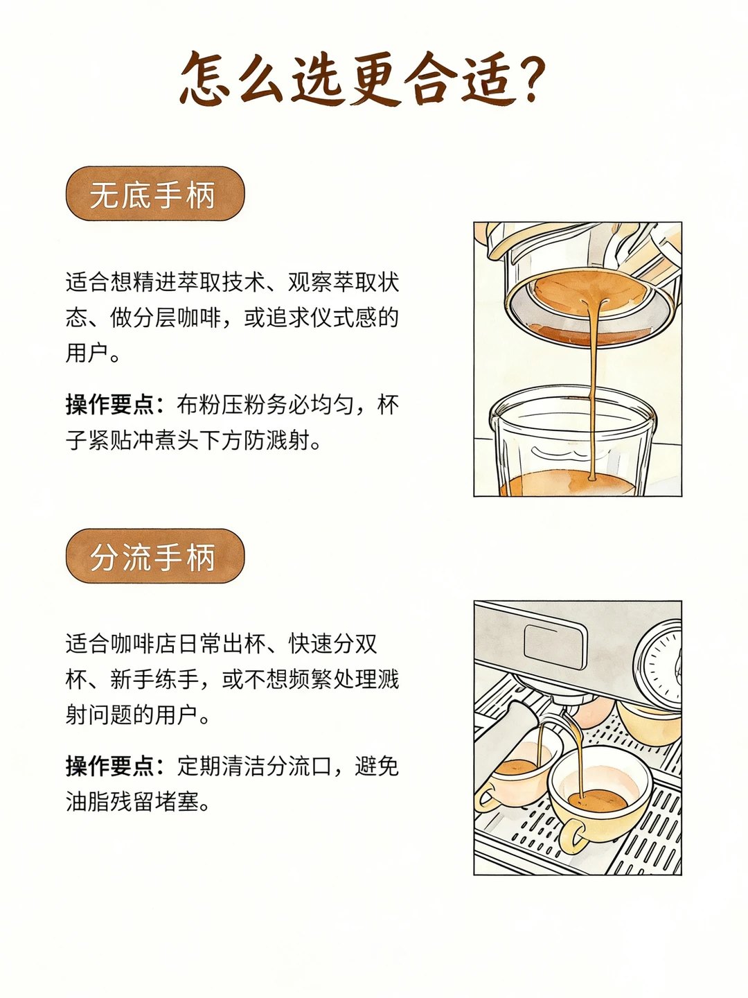 无底与分流手柄无绝对优劣,核心看使用需求。 无底手柄:可直观观察萃取状态,易发现偏流、通道问题,油脂保留更好,对布粉压粉要求高,适合精进技术、做精品出品。 分流手柄:容错率高,防溅易出双杯,适配日常高效出杯,更适合新手。 两者对咖啡核心风味影响极小,差异仅在萃取可控性。 新手 / 门店出杯选分流,追求萃取精准选无底。