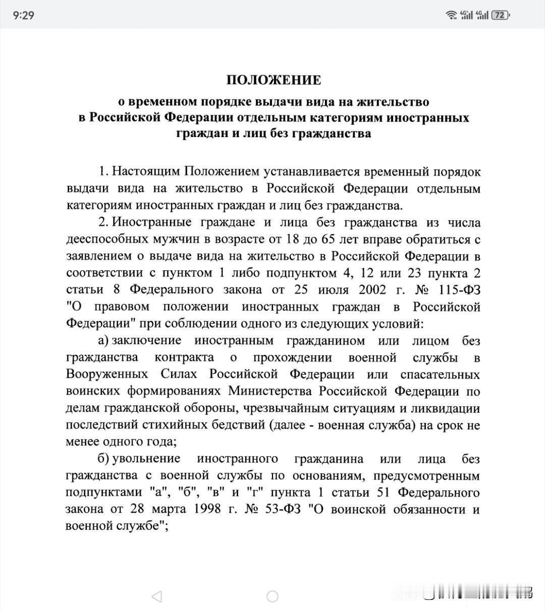 #俄乌冲突# 这两天#在俄长期居留男性须服兵役1年# 的俄罗斯新法律在中文互联网上引发热议,那么问题来了,观察者网的相关帖文是否言过其实呢? 肥鹅特意找了俄罗斯朋友专门查证了所涉文件及其中关于该类外国公民及无国籍人士的条款。文件中并未出现“必须”二字…… 我们一起来读一读: 规定/条例 关于暂时规定在俄罗斯联邦为特定类别外国公民和无国籍人士发放居住证的程序 本规定确立了在俄罗斯联邦为特定类别外国公民和无国籍人士暂时发放居住证的程序。 年龄在18至65周岁的外国公民和无国籍人士,根据2002年7月25日第115 - ФЗ号《关于俄罗斯联邦外国公民法律地位》法律中第1款第4项、第12项或第2款第8项之规定,在满足以下任一条件时,有权申请在俄罗斯联邦的居住证: a) 与俄罗斯联邦武装力量签订在俄罗斯联邦武装力量作战部队或俄罗斯联邦国防部救援编队服役的合同,在紧急情况或戒严条件下服役期限不少于一年(后者为战时服役); b) 无国籍人士根据1998年3月28日第53 - ФЗ号《关于兵役和服役》联邦法律第51条第1款“a”、“б”、“b”和“r”项规定的预备役类别,履行与军事义务相关的职责;
