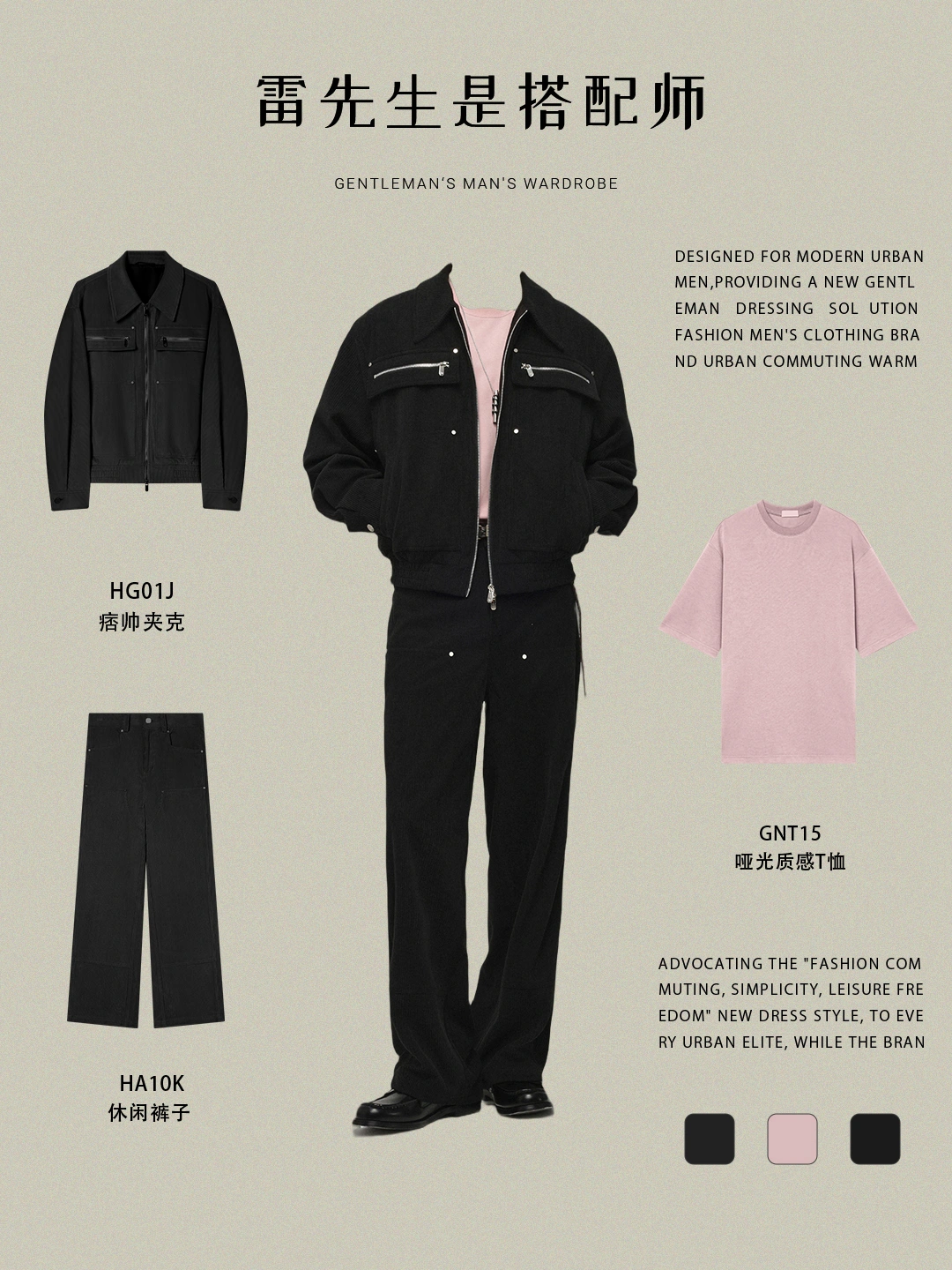 Look 3:冷淡高级感(哑光黑 + 烟粉色)全黑套装难免显得沉重,内搭一件低饱和度的粉色T恤做局部提亮,瞬间平衡了黑色的冷冽,时髦得刚刚好,周五下班后的聚会、日常通勤