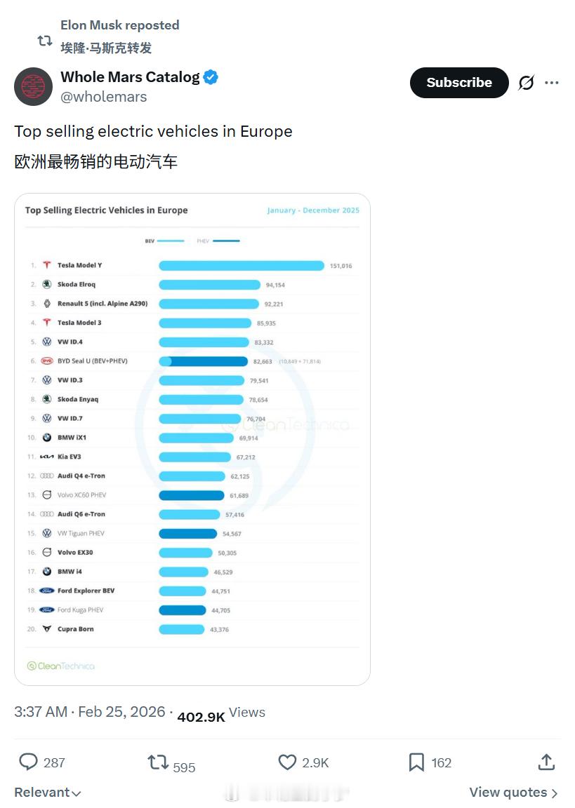 2025年,特斯拉Model Y在欧洲卖得挺好,全年一共卖了15万多辆,是当地最受欢迎的电动车。