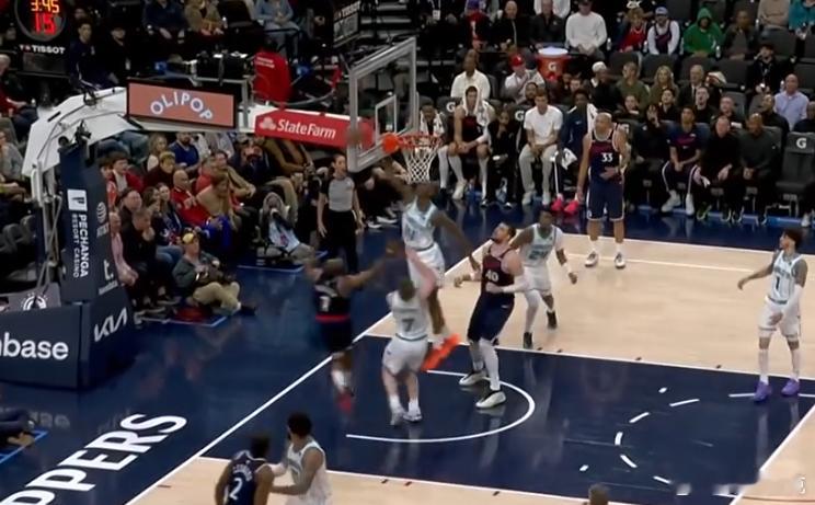 12345混乱局面下KJ辛普森抄截贝利给克莱顿的长传,突破直杀篮下上篮不中,迪亚巴特跟进至篮下高高跃起在乐福头顶将球点进篮筐,节末命中压哨补篮。