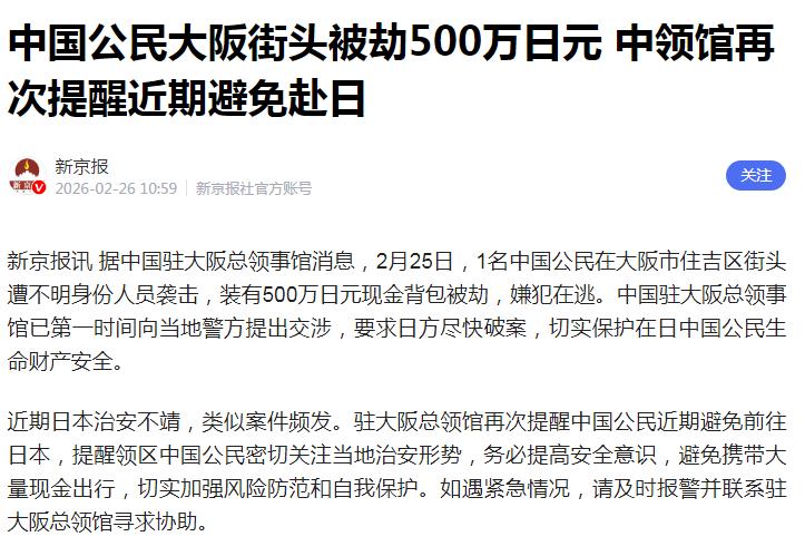 中国人在日本街头被抢劫500万日元,约合21万9千余人民币。 一边是官方苦口婆心建议不要去,一边是春节假期去了13万人次。 按说你去就去吧,有些“理中客”还非要给自己套个貌似高尚的理由来阴阳别人,这才是最让人不齿的。