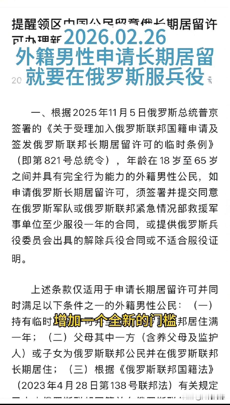想娶俄罗斯美女,并且想在俄罗斯长期居住的哥们,现在需要注意了,从2026年起,对于满足相关条件的、在俄罗斯长期居住的外籍男人,按照俄罗斯的有关规定,需要服兵役了,虽然俄罗斯美女确实漂亮,在俄罗斯生活也很舒适,但是如果服兵役的话,懂的人都懂,这意味着什么,就不用多说了!
