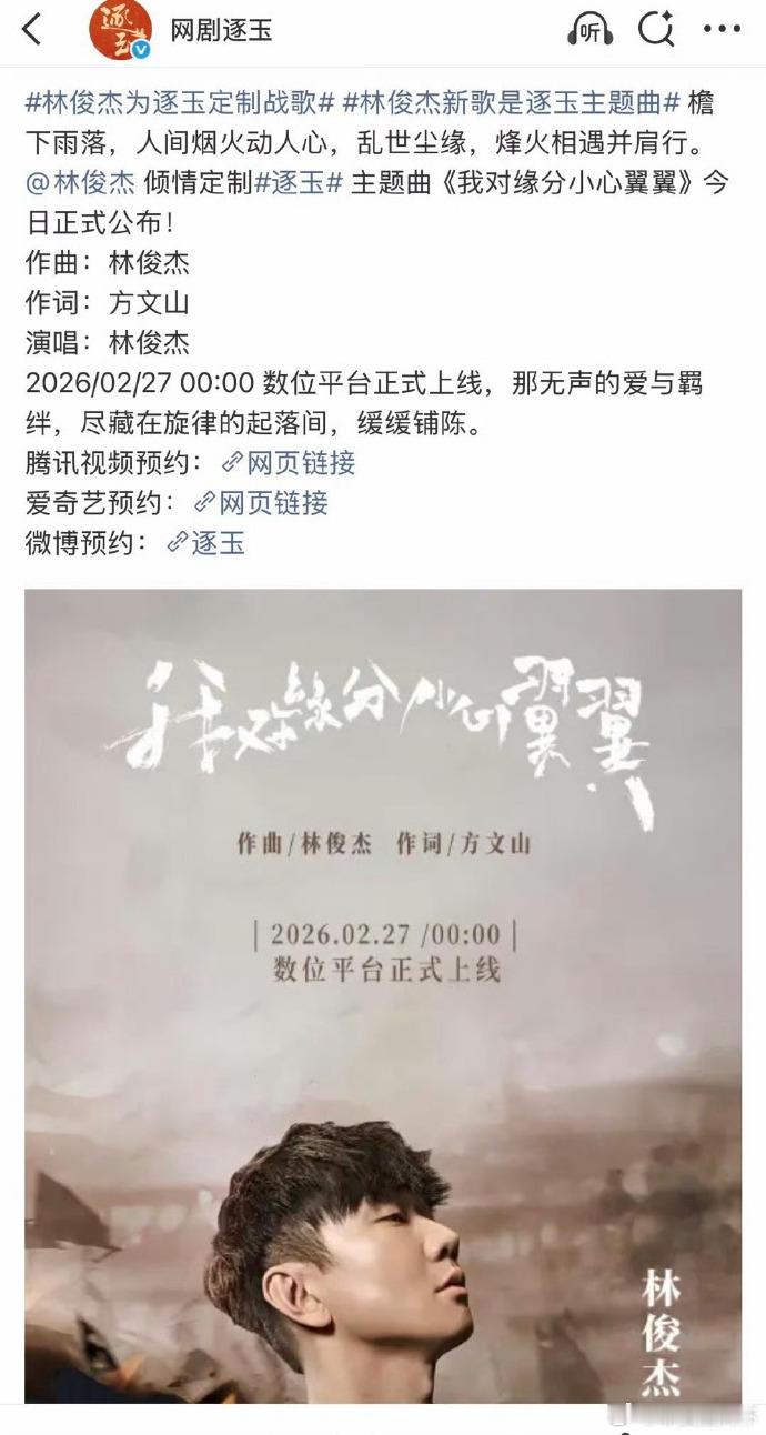 林俊杰作曲方文山作词逐玉主题曲JJ作曲演唱,方文山填词,《逐玉》主题曲这阵容,简直是王炸级别的梦幻联动!