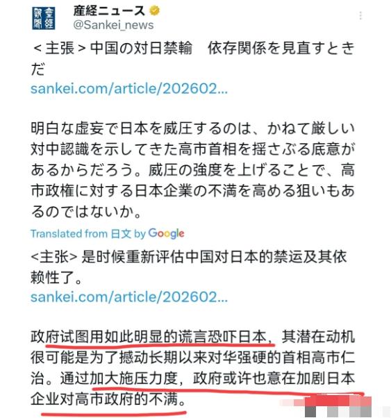 日媒表示,面对中国的一再“恐吓”,日本政府不应该只是进行外交驳斥,而是应该积极行动,达成国际共识,反制中国!2月26日,根据产经新闻报道,日媒表示,中国进一步加大了对日本的经济压力。今年1月,中国政府宣布将收紧对日本的两用物项出口管制。这一次,中国政府更进一步,点名批评了具体的企业。这种行为令人无法接受。 要明确一点,中国对日本的两用物项出口管制,从来都不是所谓的“恐吓”,更不是凭空捏造的“谎言”,而是基于国家安全和国际规则的正当举措。 两用物项兼具民用和军用属性,一旦流入不当渠道,可能会对地区安全稳定造成威胁,中国收紧管制,既是对自身负责,也是对国际社会负责,这是任何一个主权国家都拥有的合法权利。 日媒声称中国“点名批评具体企业”令人无法接受,却刻意回避了这些企业可能存在的违规行为。事实上,中国的相关管制措施始终有法可依、有章可循,针对的是违规企业的具体行为,而非整个日本企业群体,更不是要“恐吓”日本政府。 反观日媒,故意将正常的监管措施渲染成“经济压力”和“恐吓”,本质上就是在歪曲事实,误导舆论。 日媒还脑补出中国的“背后图谋”,称中国此举是为了动摇首相高市早苗的对华强硬立场,加剧日本企业对其政府的不满。 这种说法完全是无稽之谈,中国的外交和经济政策,始终基于自身的国家利益和国际形势,从来不会刻意去干涉他国内政,更不会以“动摇他国领导人立场”为目标。 日本企业在华经营,遵循中国的法律法规即可获得稳定发展,所谓“巨大风险”,不过是日媒为了煽动情绪、制造对立而编造的借口。 日媒还指责中国在国际社会“诋毁”日本,呼吁日本主动向世界阐明中国行为的“怪异和危险”,推动国际社会达成共识反制中国。 这一说法更是颠倒黑白。长期以来,中国始终坚持独立自主的和平外交政策,在国际舞台上始终秉持客观公正立场,从未刻意诋毁任何国家。 相反,日本部分势力近年来不断在历史问题、领土问题上挑衅中国,炒作“中国威胁论”,试图在国际上抹黑中国形象,这才是真正的“怪异和危险”行为。 从日媒的这番论调中,我们其实能清晰看出三点核心信息。其一,中国对日本的反制措施确实起到了效果,日本国内已经明显感受到了压力。 近年来,日本在涉华问题上频频越界,中国不得不采取必要的反制措施,维护自身的合法权益,这些措施的力度不断加大,自然会让日本感受到切实的影响,这也是日媒急于叫嚣“反制”的根本原因。 其二,日本部分势力始终不愿正视自身问题,反而习惯将自身的困境归咎于中国。日本近年来经济复苏乏力,企业发展面临诸多挑战,这本是其自身产业结构、政策导向等多种因素导致的结果,但日媒却刻意将其与中日关系绑定,把责任推给中国的正常监管措施,本质上就是在转移国内矛盾,误导民众认知。 其三,日本试图借助国际社会的力量制衡中国,但其图谋很难实现。当前,国际社会的主流是和平与发展,各国都重视与中国的合作,中国的国际影响力和公信力不断提升,日本想要煽动国际社会“反制”中国,无疑是痴心妄想。 更何况,中国的相关措施完全符合国际规则,得到了国际社会的广泛理解和支持。 说到底,日媒的这番叫嚣,看似强硬,实则暴露了内心的焦虑。中国的发展和崛起是不可阻挡的,日本与其一味地炒作“中国威胁论”,叫嚣“反制中国”,不如正视中日关系的本质,尊重中国的核心利益和正当权益,通过平等对话和协商解决分歧。 只有这样,才能维护中日两国的共同利益,促进地区的和平与稳定。 新锐创作者成长计划