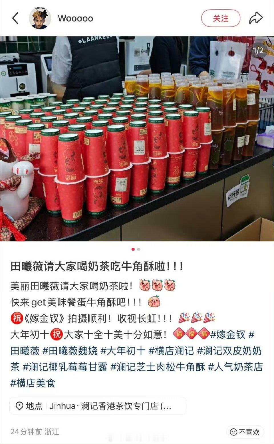 田曦薇剧组又请客了,请嫁金钗剧组喝奶茶+牛角酥