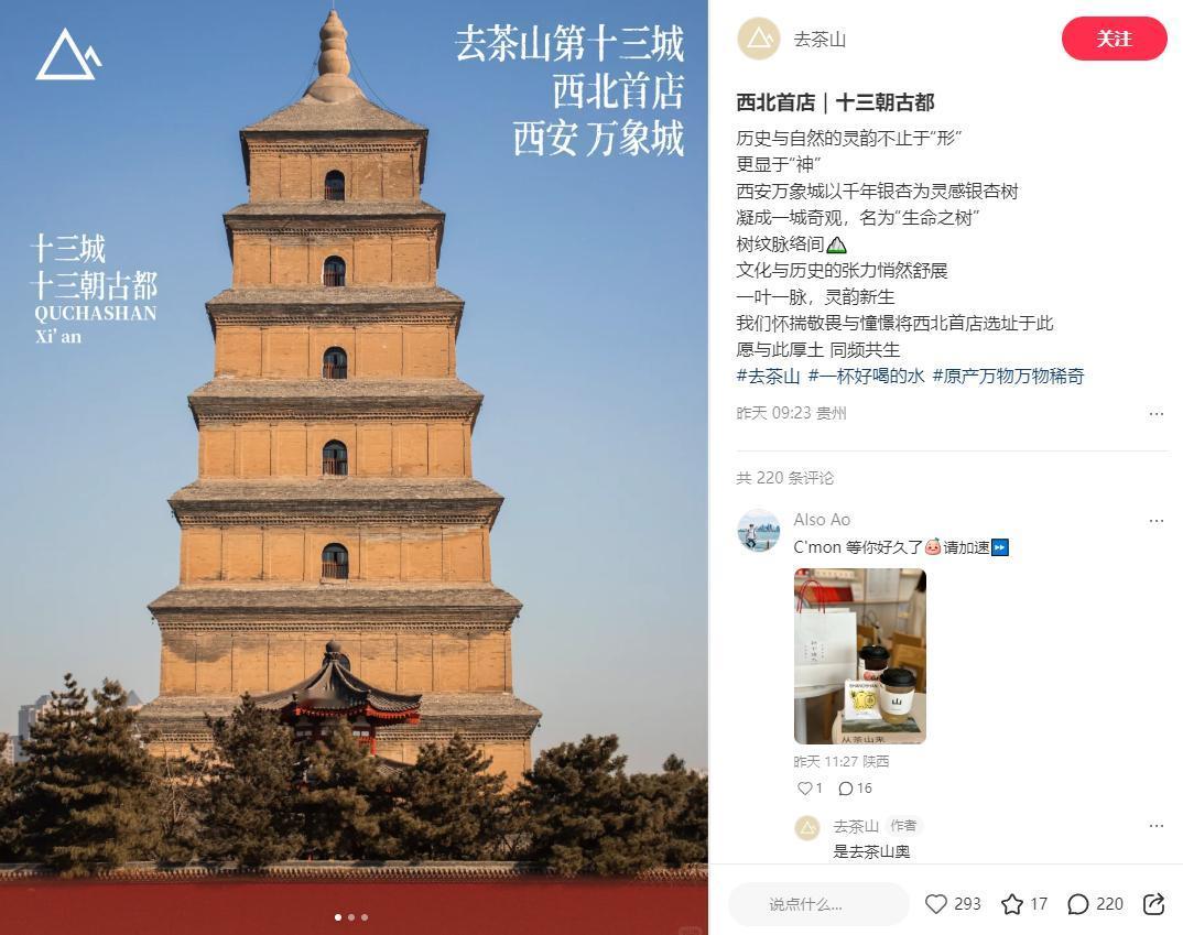新式茶饮「去茶山」官宣西安将成为其进驻的第13座城市,首店登陆西安万象城南区。同时,品牌方连续三天对新店发布相关宣传信息,且在文案中强调西安系向北出发的第一站,需要说明的是,当前已开出50余家门店均在南方地区。