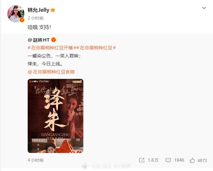 白鹿卢昱晓宣传赵晴新剧林允王星越为赵晴新剧打call 赵晴新剧《在你眉梢种红豆》