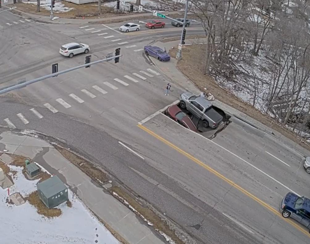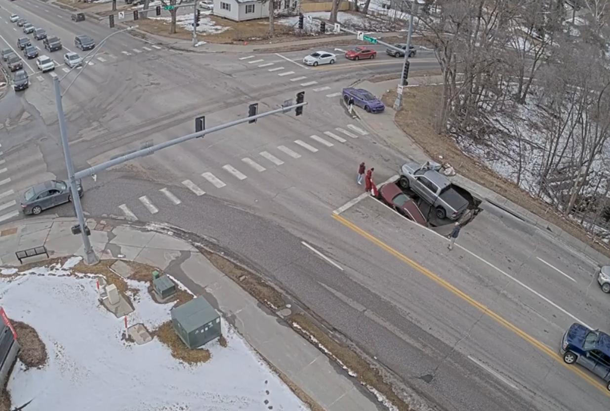 内布拉斯加大学奥马哈分校的监控录像,录像显示,2026年2月24日,两辆车在太平洋街的一个十字路口突然坠入一个塌陷坑中,所幸无人受伤,但交通严重受阻。 评论中赞扬了那些倒车脱险并协助救援的司机 。 根据美国地质调查局(USGS)的数据,此类塌陷坑通常是由地下水侵蚀或公用设施故障引起的;此次事件凸显了老旧城区定期进行基础设施检查的必要性。