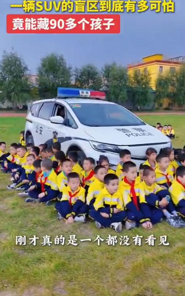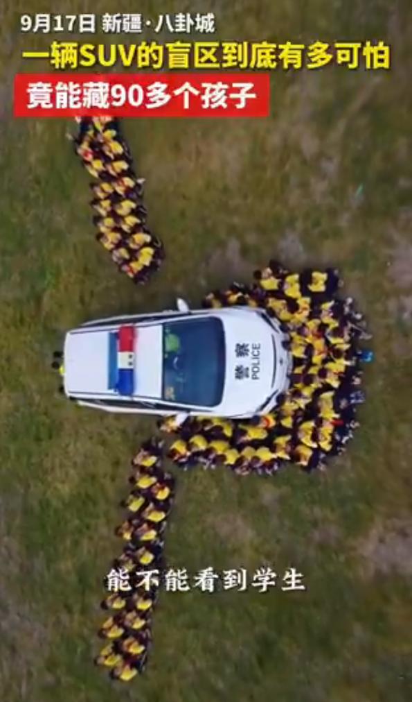 一辆SUV的盲区有多大? 中国警方安全意识宣传视频,视频中90名身穿黄色背心的幼