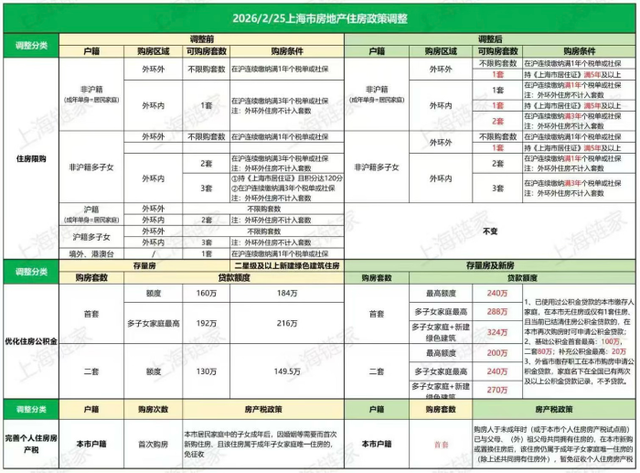 2月25日,上海市住房城乡建设管理委、市房屋管理局、市财政局、市税务局、市公积金管理中心等五部门联合印发《关于进一步优化调整本市房地产政策的通知》(下称《通知》),并宣布自2026年2月26日起施行。