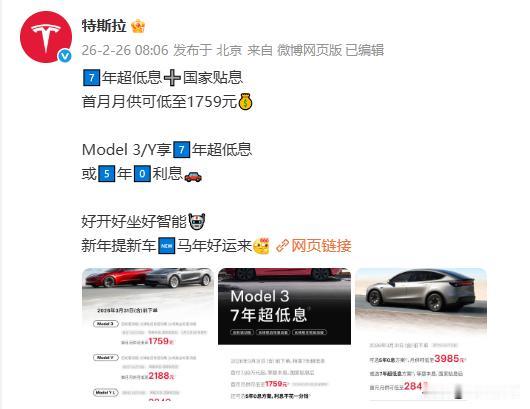 电车30万:使用10年,电费1万,卖1.5万; 油车30万:使用10年,油费10万,卖3万; 混动30万:使用10年,费用4万,卖3万。 新的一年,电车、油车、混动你怎么选 如果说电车,那么我认为只有两个牌子 一个是特斯拉,一个是其他。 特斯拉中国推出新购车金融方案 低息零息并行 应对在华市场竞争与销量压力 2月26日,特斯拉中国正式发布新一轮购车金融政策,凡在2026年3月31日(含)前下单的消费者,可选择7年期超低息贷款购车方案,其旗下三款主力车型同时提供5年期0息贷款方案供用户自主选择。这是特斯拉中国继2026年1月推出购车金融方案后,再次通过金融优惠形式刺激国内市场消费需求。 作为新能源汽车领域的代表性品牌,特斯拉在动力电池技术与热管理系统方面具备成熟的技术积累,电池系统在稳定性、安全性与使用寿命等方面拥有行业公认的技术特点,也是其产品核心技术构成之一。