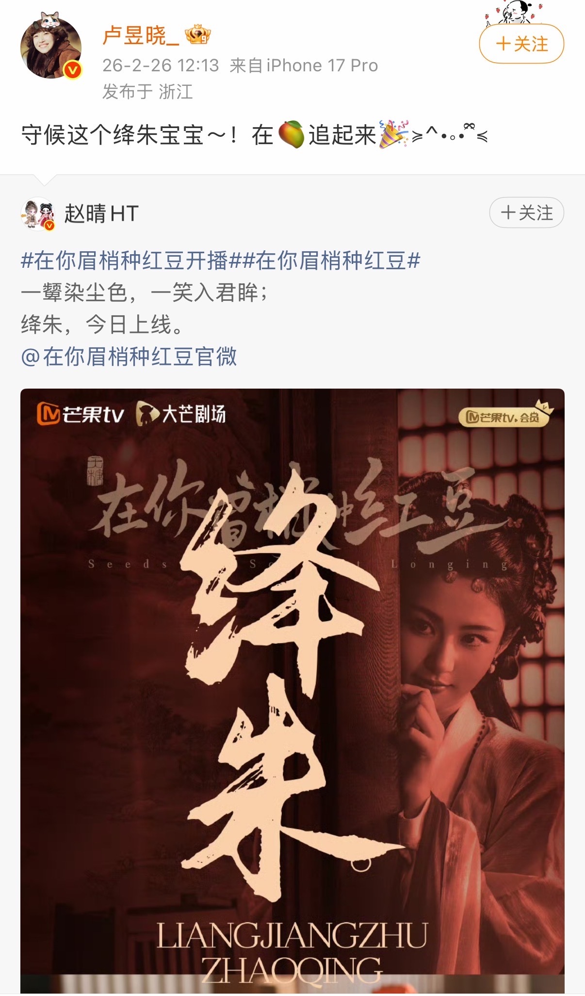 赵晴新剧剧宣人脉 赵晴新剧《在你眉梢种红豆》剧宣人脉,真的是强的没边了呀,在转发群里面看到了很多好朋友呢,有白鹿,卢昱晓,王星越!