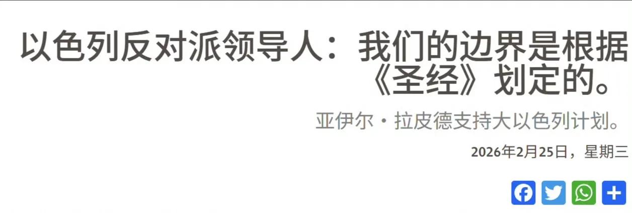 以色列反对党领袖拉皮德宣布支持“大以色列”计划,也就是占领从尼罗河到幼发拉底河的全部土地。 他的理由和其他以色列政客的理由一样,即以色列的领土合法性是《圣经》赋予的,因此《圣经》叙事的地理边界就应该是以色列的合法领土边界。 其实,以色列一直就以《圣经》为依据,在巴勒斯坦地区扩张。现在就更加狂妄,都拿着《圣经》叫嚣要占领从西亚到北非的广阔土地了。 很多人将伊朗称为神棍国家,其实以色列、美国之流才是真正的神棍国家。